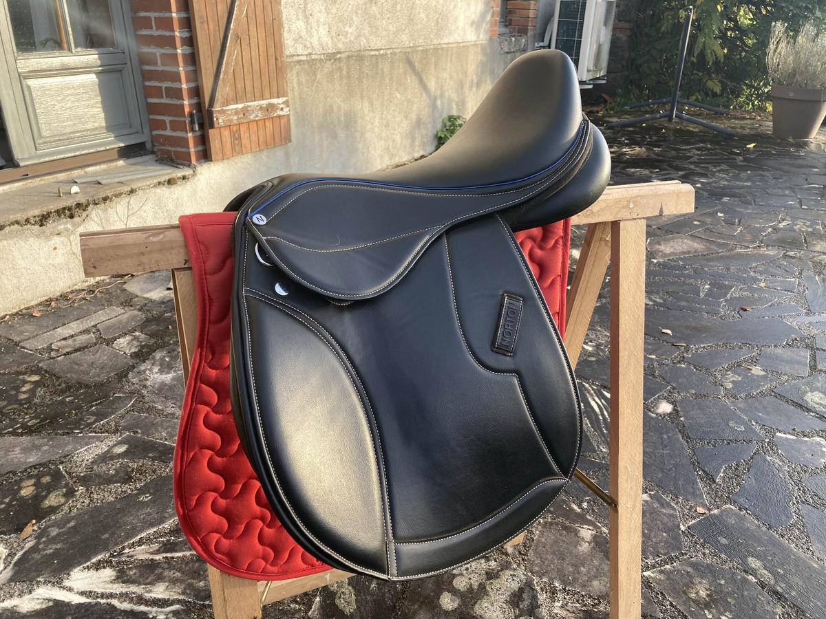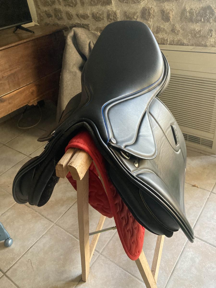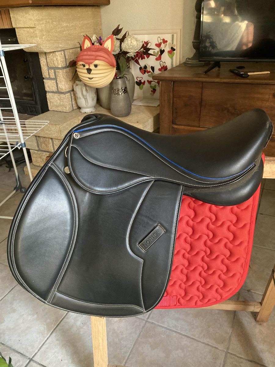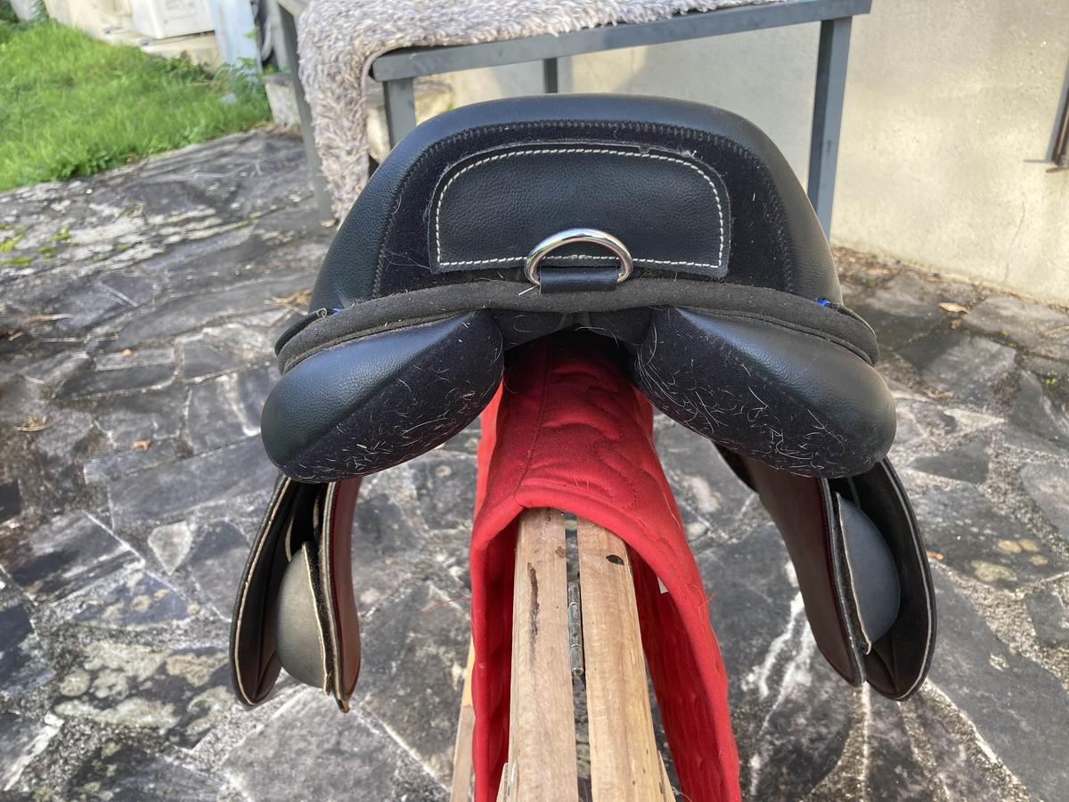 selle état neuf équipée d’une arcade interchangeable actuellement bleue. rouleaux de génois sur velcro ce qui permet au cavalier de bien se positionner. fabriquée dans un matériau antidérapant, résistant : cuir synthétique, rexine Eva et tissu synthétique laminé