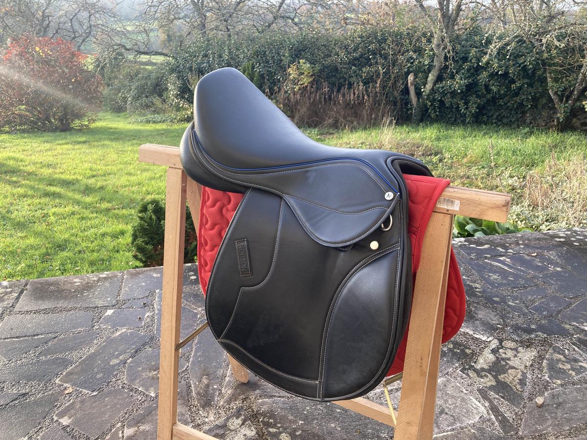 selle état neuf équipée d’une arcade interchangeable actuellement bleue. rouleaux de génois sur velcro ce qui permet au cavalier de bien se positionner. fabriquée dans un matériau antidérapant, résistant : cuir synthétique, rexine Eva et tissu synthétique laminé