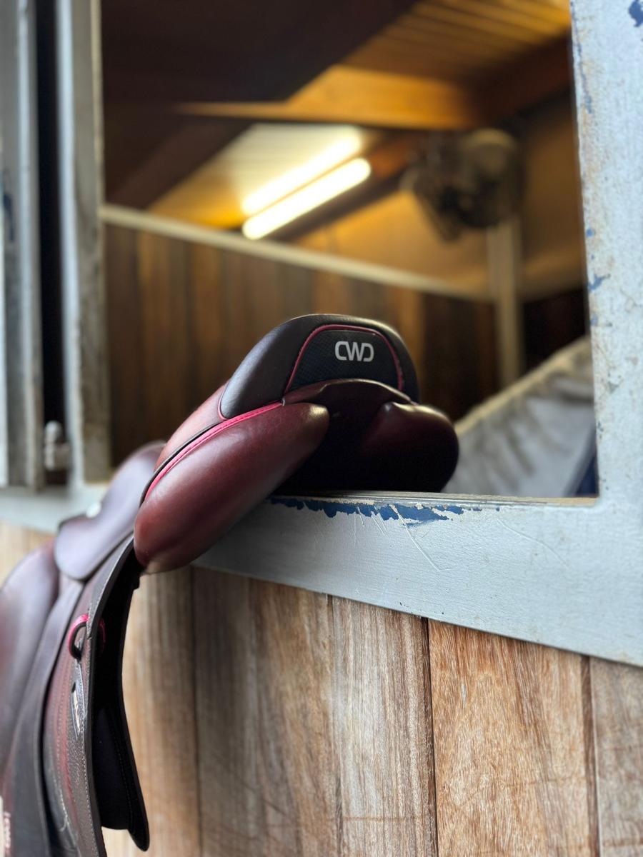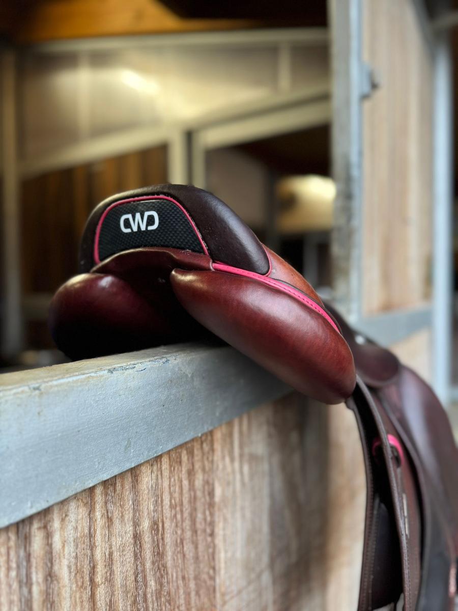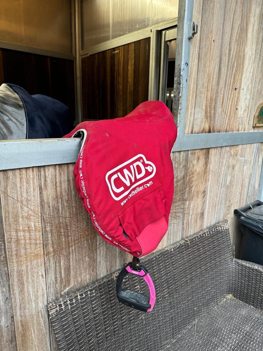 A vendre Selle CWD Mademoiselle 2GS, Taille 16,5, référence SE32096594, couleur des liserets rose. Peut-être vendue avec les étrivières et les étriers