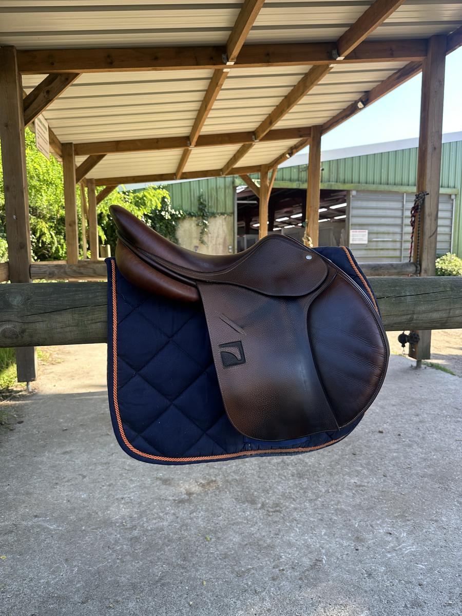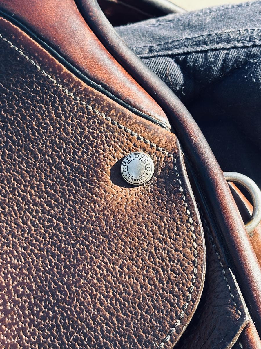 À vendre selle Childeric de 2018, taille 17,5 marron logo noir.