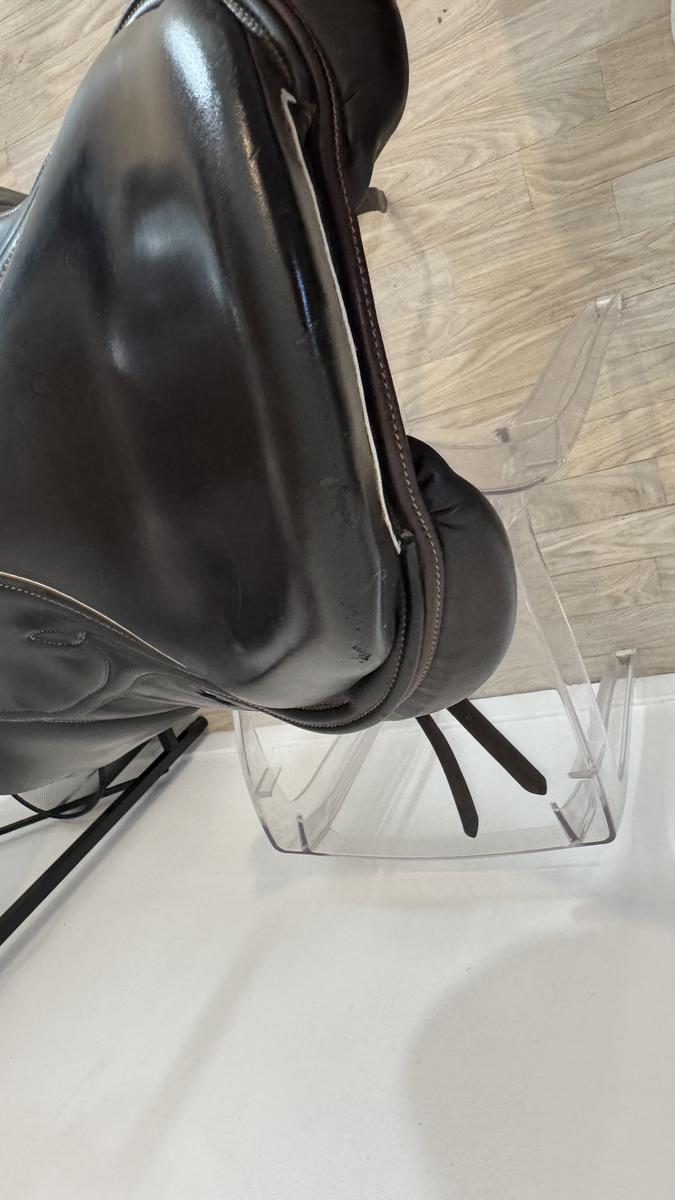 Elle présente seulement deux petits défauts visibles sur les photos : une légère auréole sur le siège et une usure légère (un peu râpée) sur le haut du troussequin, due à l’usage normal.