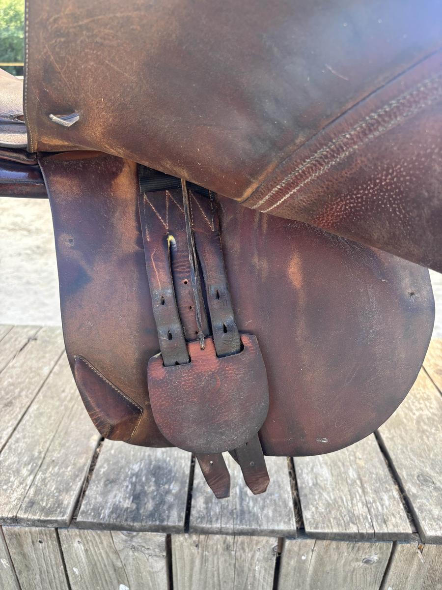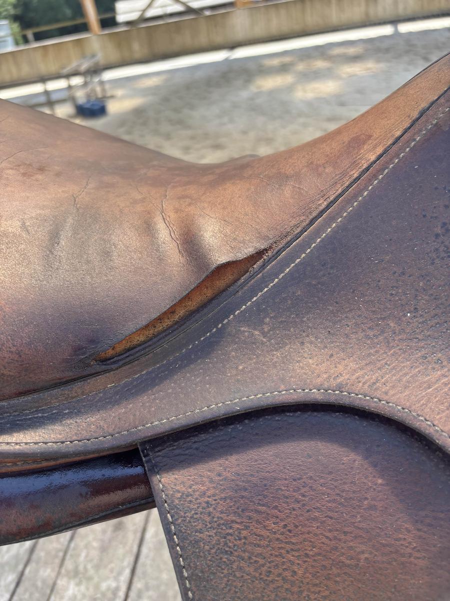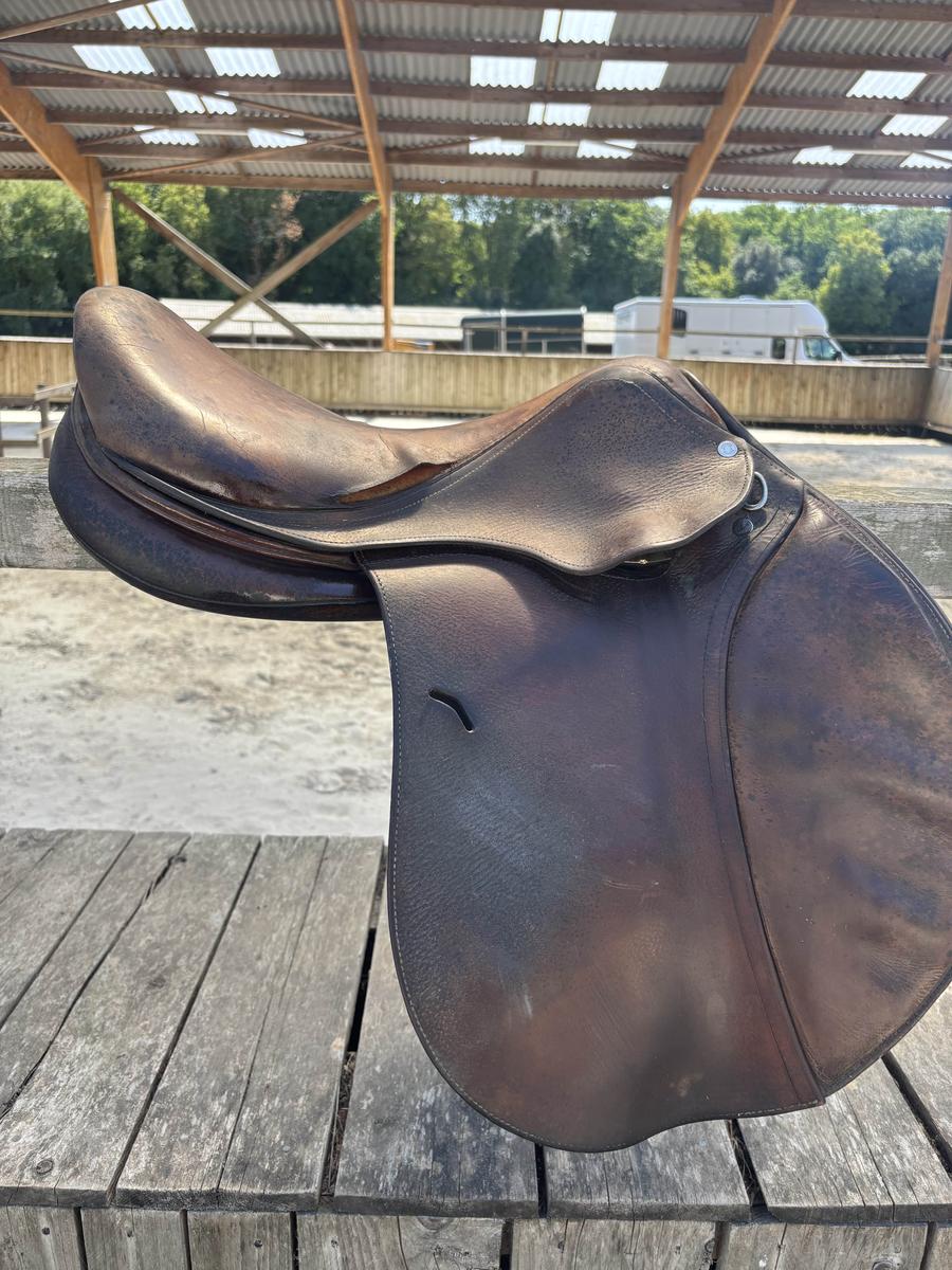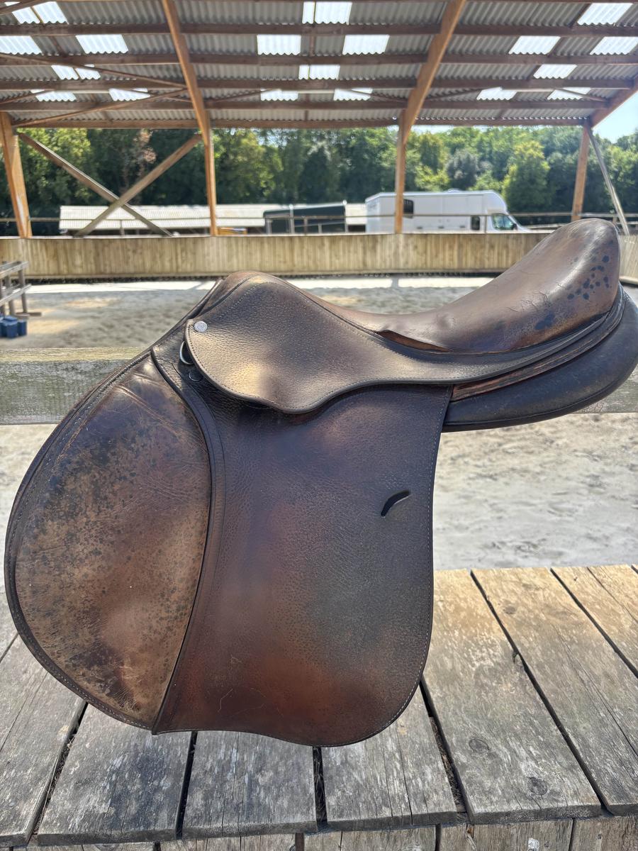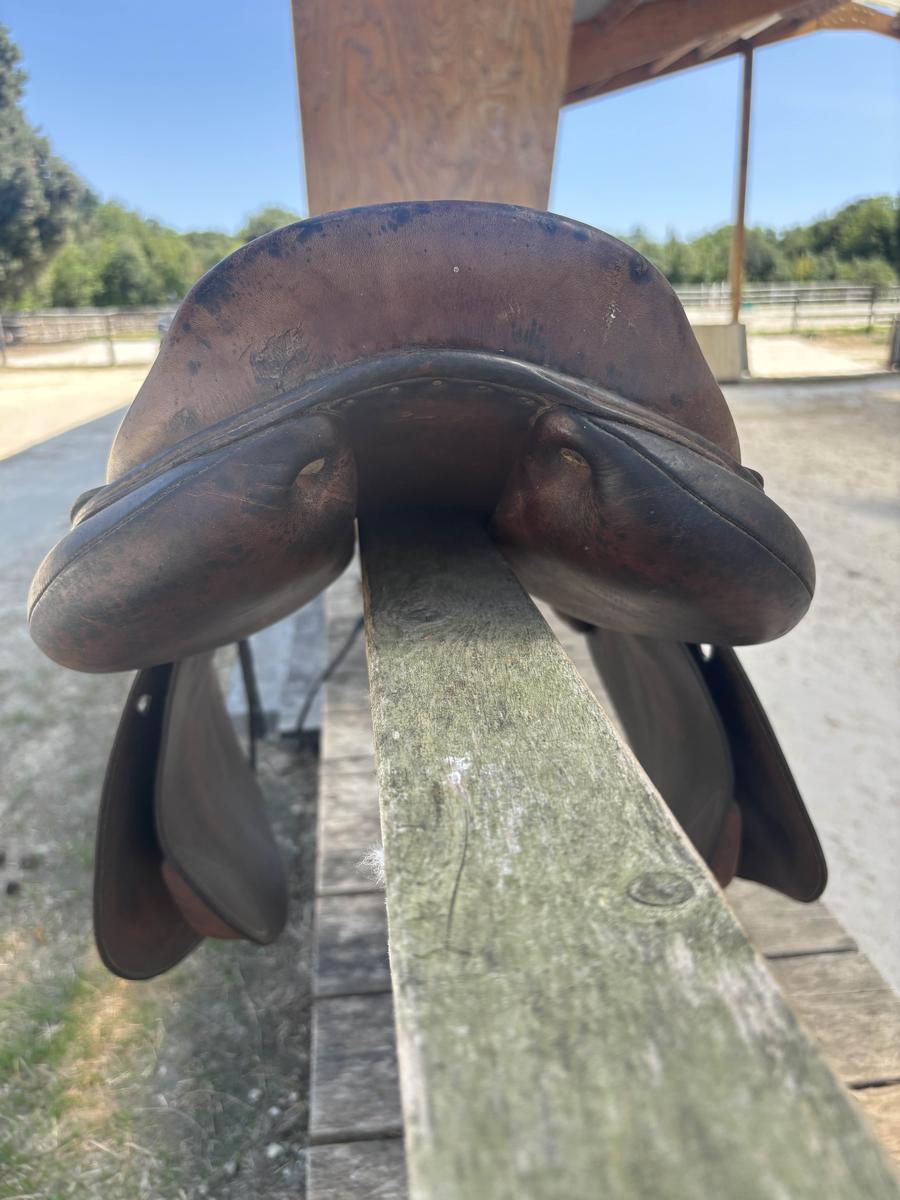 À VENDRE SELLE ANTARÈS 2008 TAILLE 18 ÉTAT USÉ TROU DE CHAQUE CÔTÉ DU SIÈGE MAIS RESTE FONCTIONNELLE PETIT PRIX EN CONSÉQUENCE