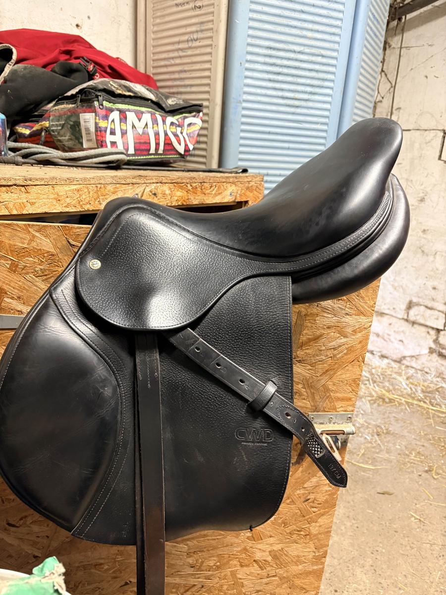 vend selle cwd (achat d'une autre selle) selle toujours très bien entretenu elle a 1 défaut au niveau du sanglons à droite il est décousu mais n'empêche en rien sont utilisation je la vend equipe d'une bavette noir norton utilisé 1 fois (135cm ) d'une sangle simple noir doublé mouton norton (135 cm ) d'une paire d'étrivière et d'une paire d'étirer freejumps orange et noir