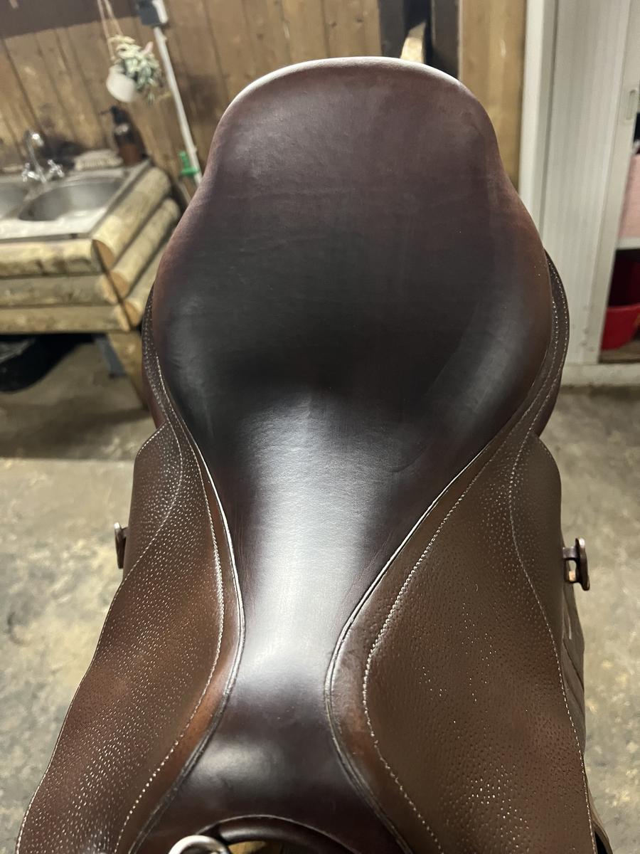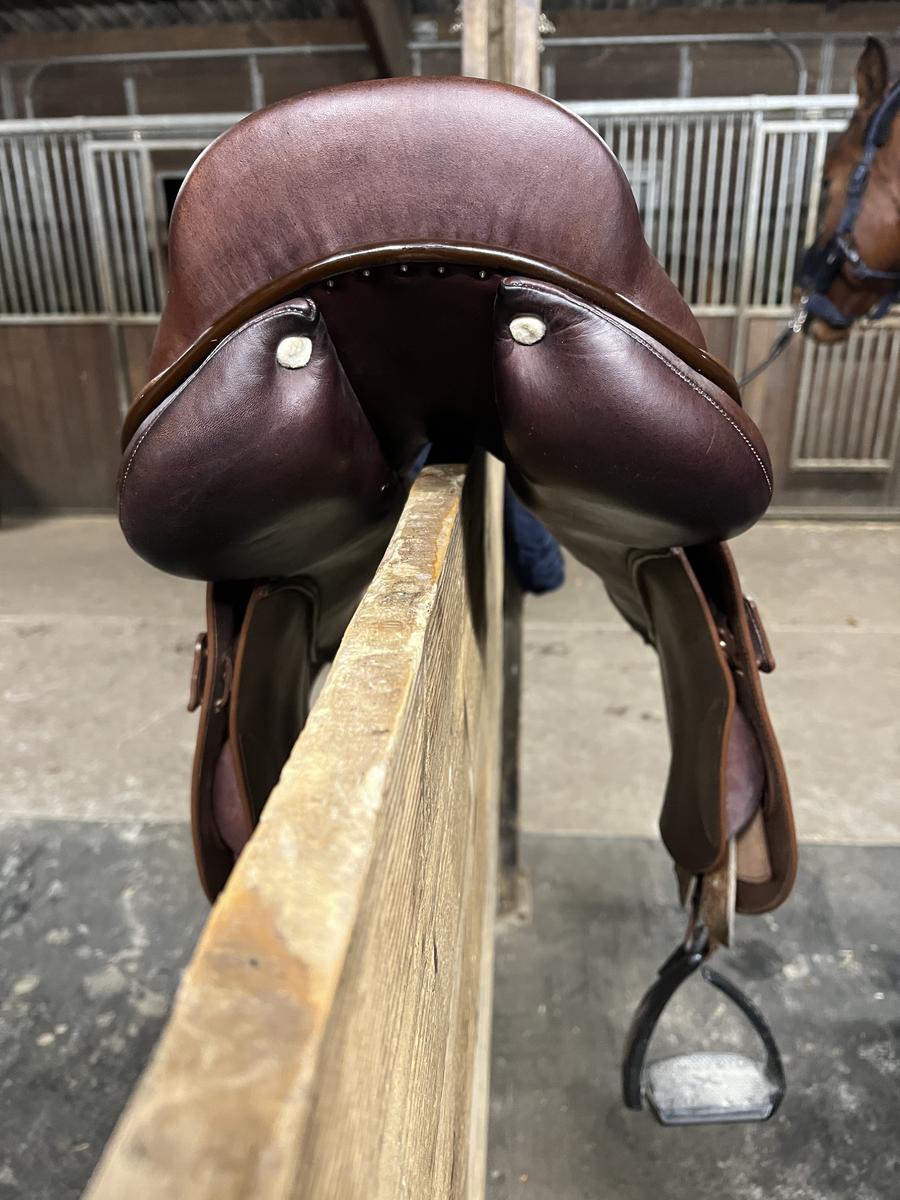 Superbe selle GBS semi-creuse, modèle 2023, en cuir marron. Taille 17 pouces, quartiers 2AV3. Finitions élégantes avec jonc arrière et passage d’étrivière verni choco.