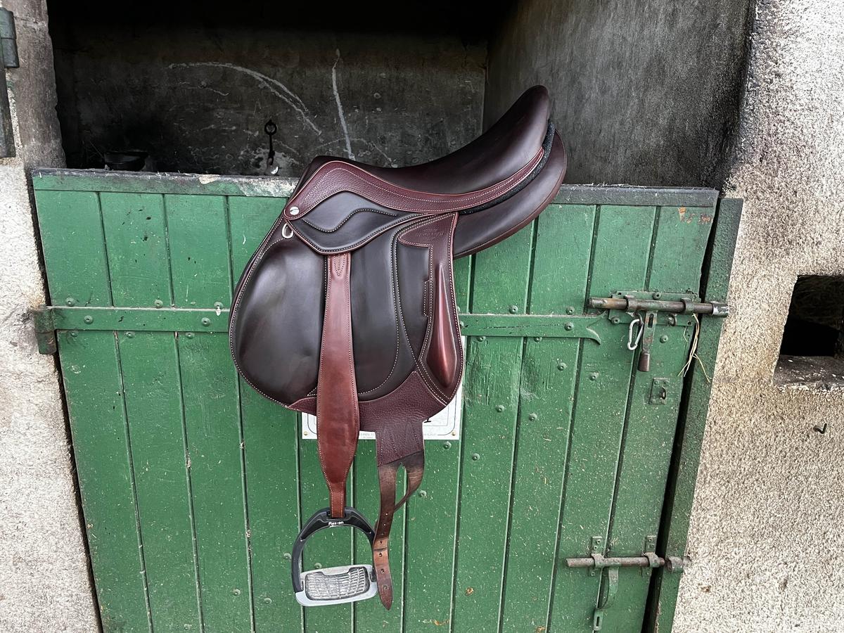 Possibilité de rajouter une paire d’étrivières monobranches Devoucoux en taille S et des étriers Flex-On plancher incliné ultra grip gris (voir sur les photos).