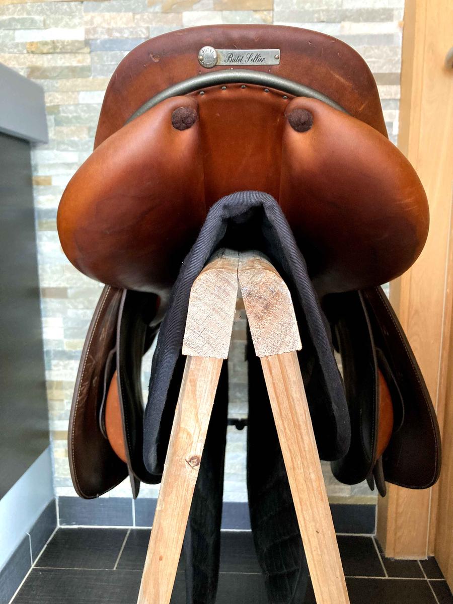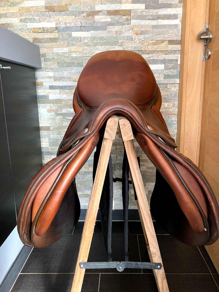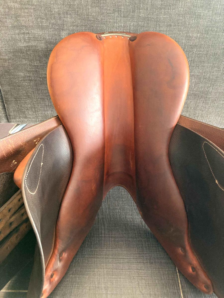 Selle saut d'obstacle avec siège semi plat Finition Doublé veau Taille 17" Taille de quartier 225 Année 2021 Vendue nue avec housse Très bon état Possibilité vente équipée étrivières mono branche marron