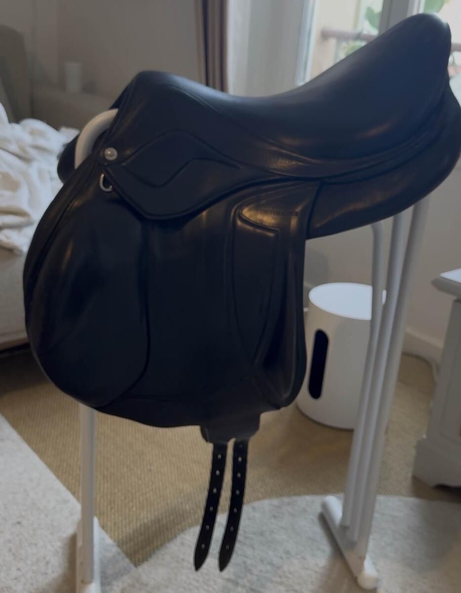 selle Devoucoux modèle Chiberta Lab en noir option cristaux Swarovski noir taille 001 (17”) quartiers 1A arcade normal, pose très bien sûr un cheval avec du garrot