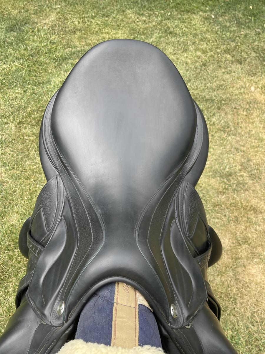 A vendre: selle Chiberta Lab noire en taille 17.5 acheté en 2019 vendue avec étrivières. La selle a les taquets abimés (possibilité de les faire réparer chez Devoucoux).