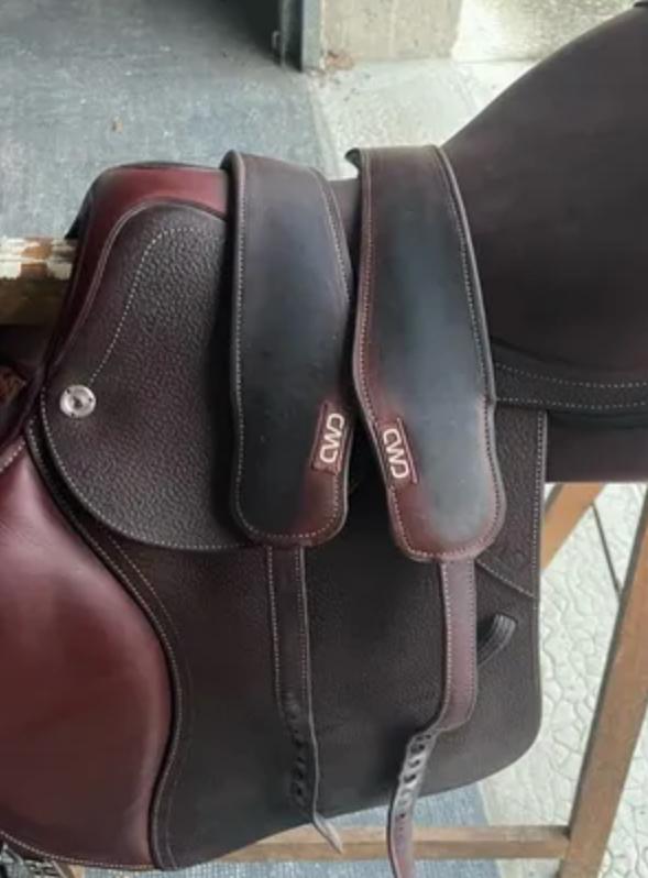 Selle couleur châtaigne d’avril 2024 en excellent état. Taille 17,5 pouces, siège plat. Était utilisée par une personne d’1m75 sur un cheval de selle d’1m70, dos normal. La médaille avec le nom sera remplacée par une vierge avant achat. Option paillettes Black Diamonds extrêmement discret. Peut être vendue seule, ou avec les étrivières plates taille M, la sangle KENTUCKY 145cm (prix neuf 89,99€), les étriers SPRENGER system 4 Tarif négociable.Cause : vente du cheval