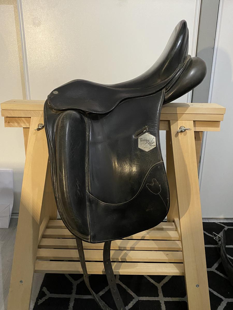 Je met à la vente ma selle de dressage Time rider, 17,5 pouces Siège confortable ! Toujours entretenue correctement, Sera évidemment nettoyer et graisser avant la vente. Convient sur tout types de chevaux, vendue avec les étrivières, étriers et housse. Prix négociable dans la limite du raisonnable :) 950€