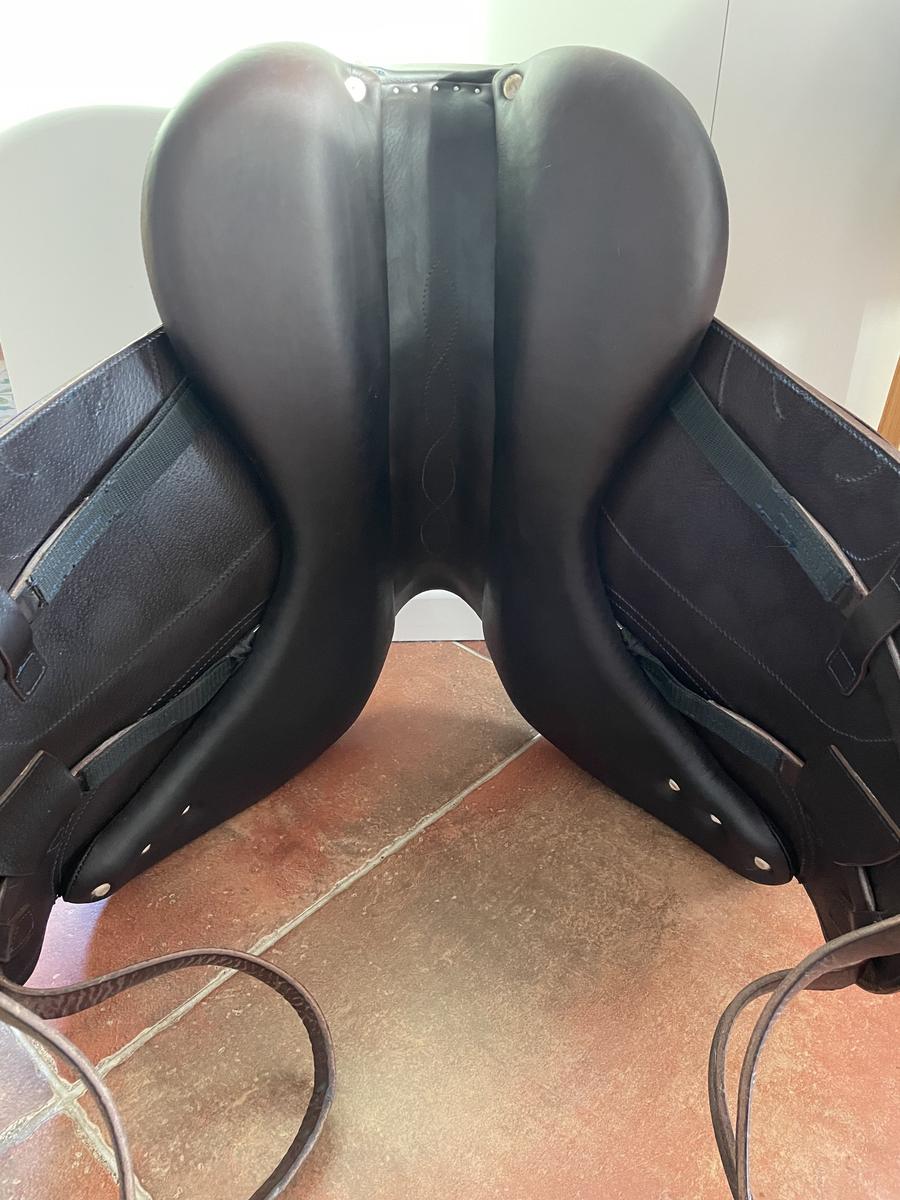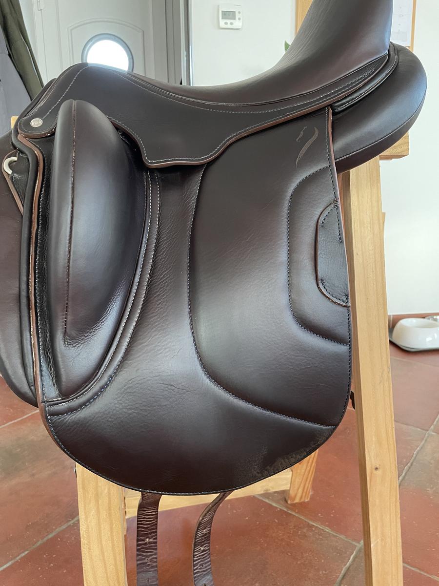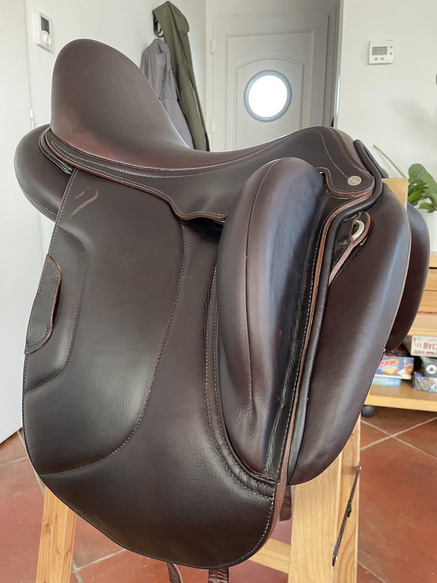 Elle est comme neuve : elle a très peu servi car j'ai été immobilisée 6 mois en 2022 pour blessure puis j'ai perdu mon cheval de DP en avril 2023 pour lequel elle était adaptée : un SF d'1m68 au garrot saillant. L 'arcade est donc conçue en fonction (arcade fermée).