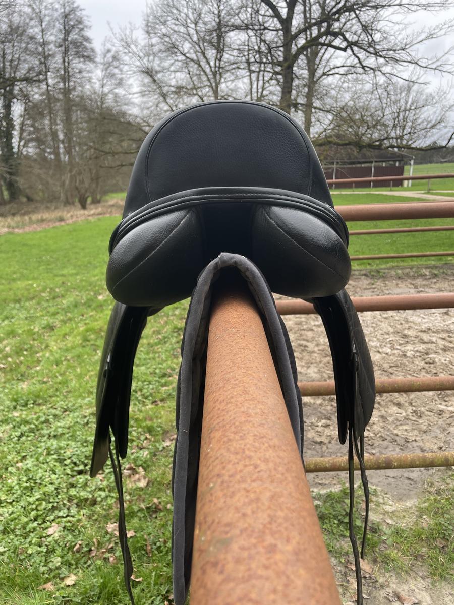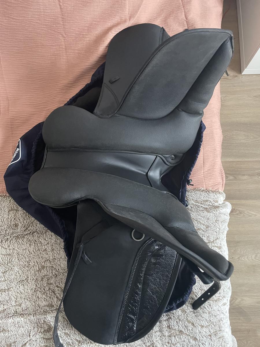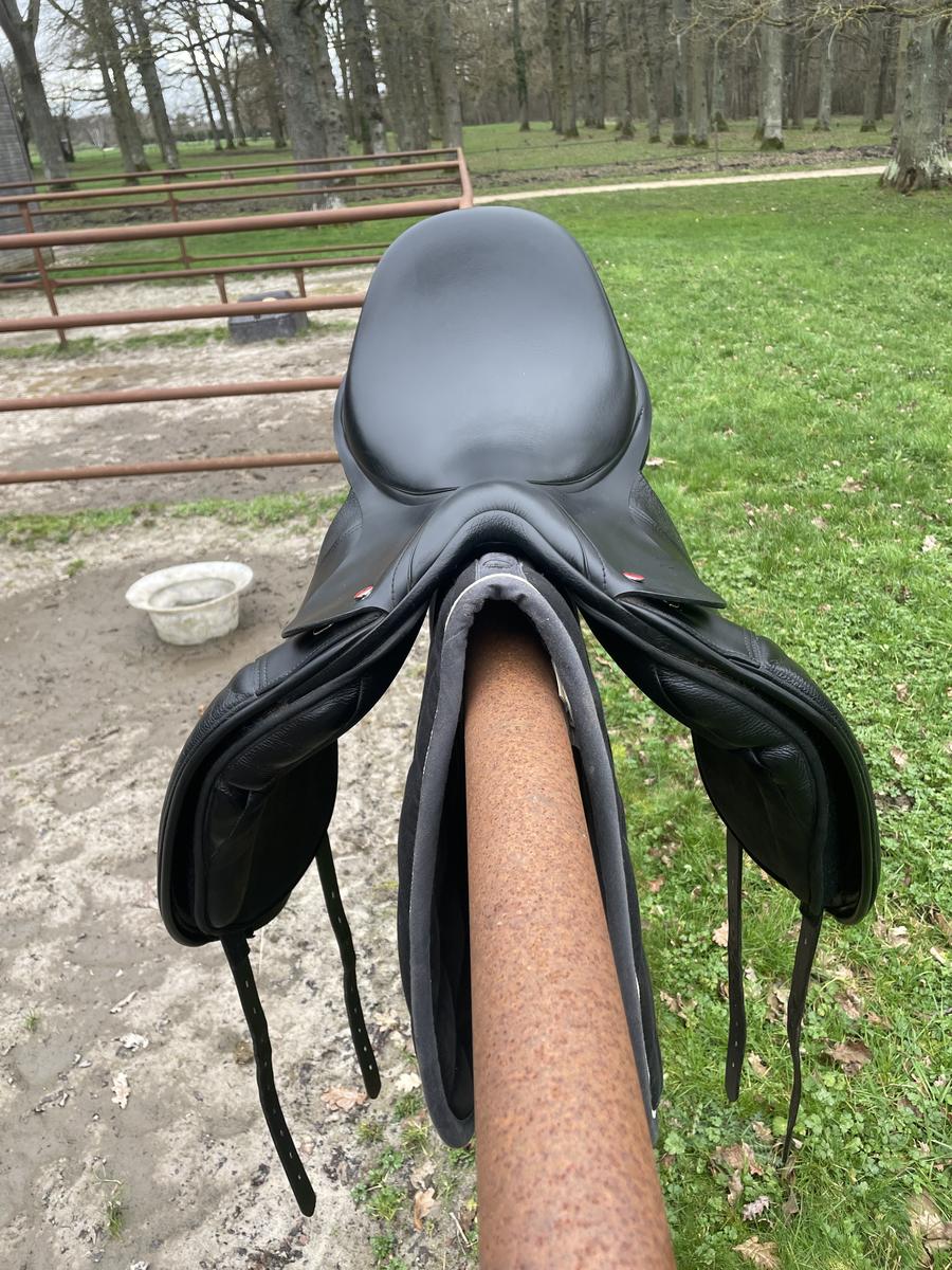 La selle est en partie en synthétique et en partie en cuir. Les taquets sont amovibles avec scratch. Matelassures en laine. Arcade interchangeable, actuellement avec l'arcade jaune, la plus large. Vendue nue mais avec sa housse.