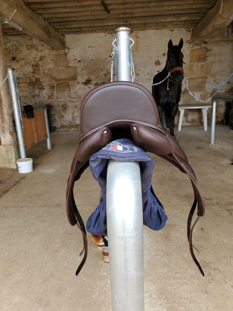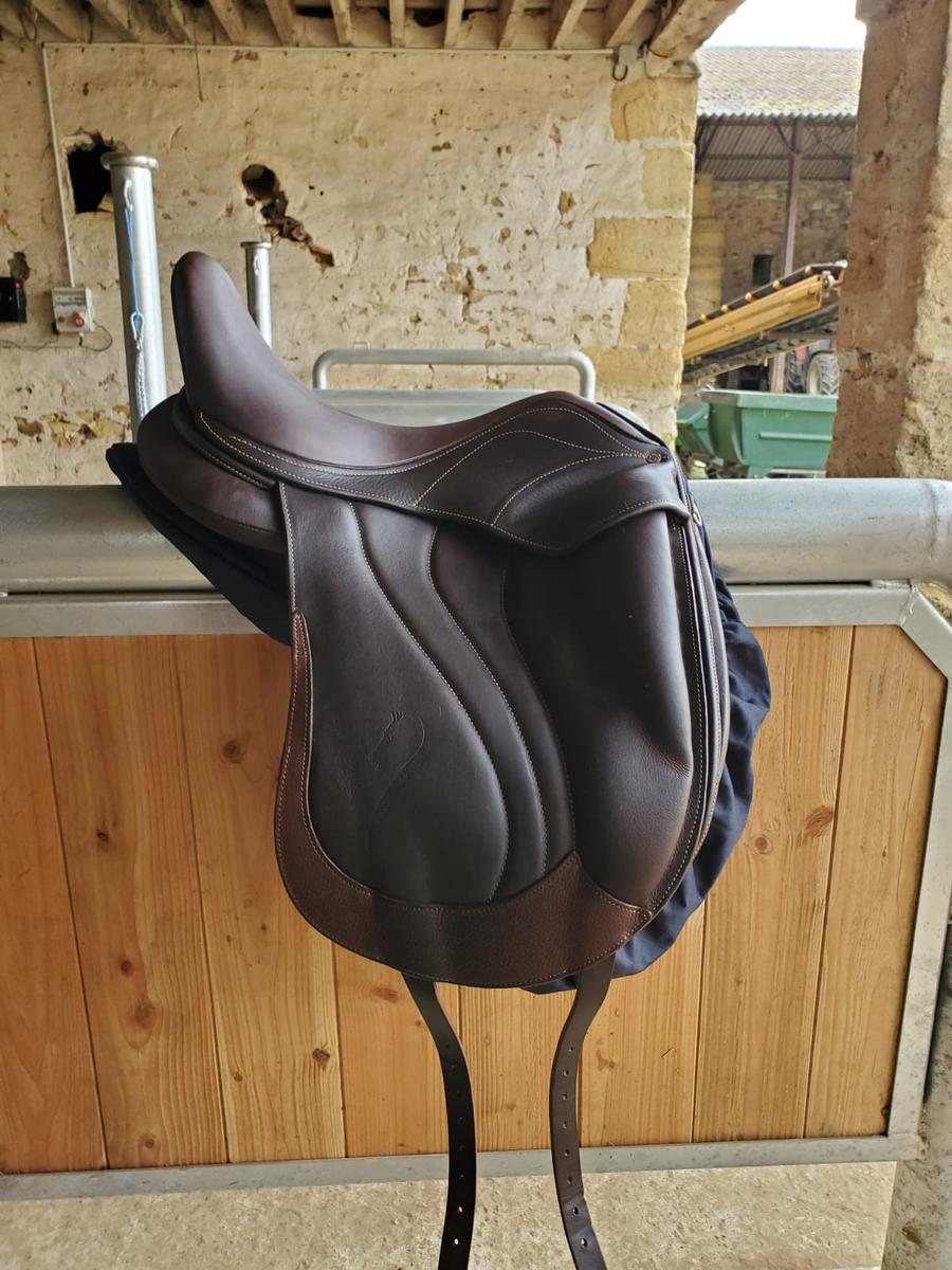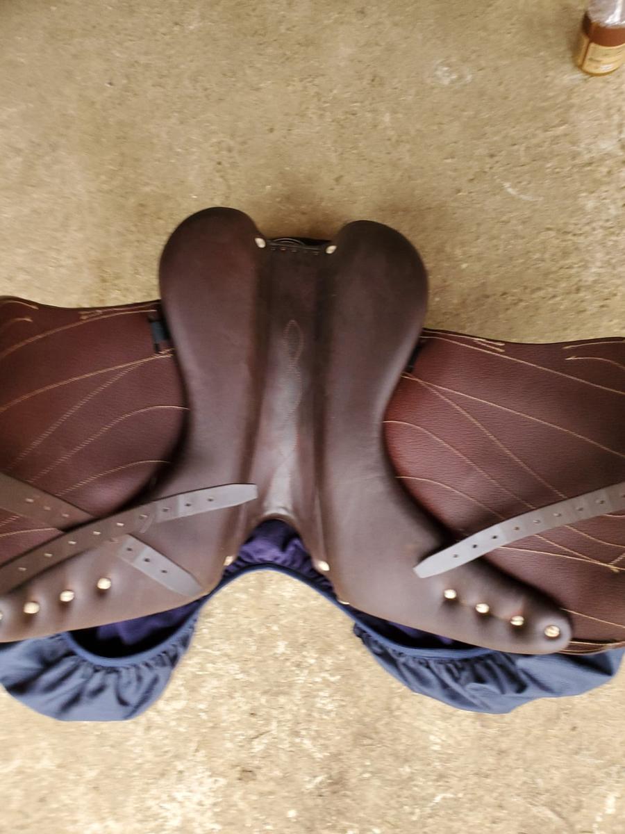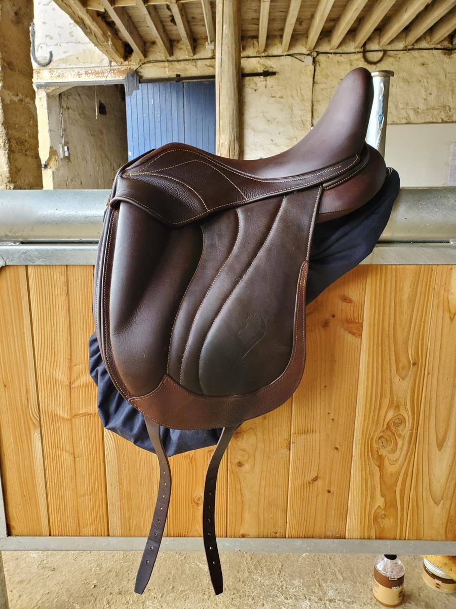 Comme neuve, c'est un vrai fauteuil. Je m'en sépare car mon cheval (pur sang) a besoin d'une selle bcp moins large.