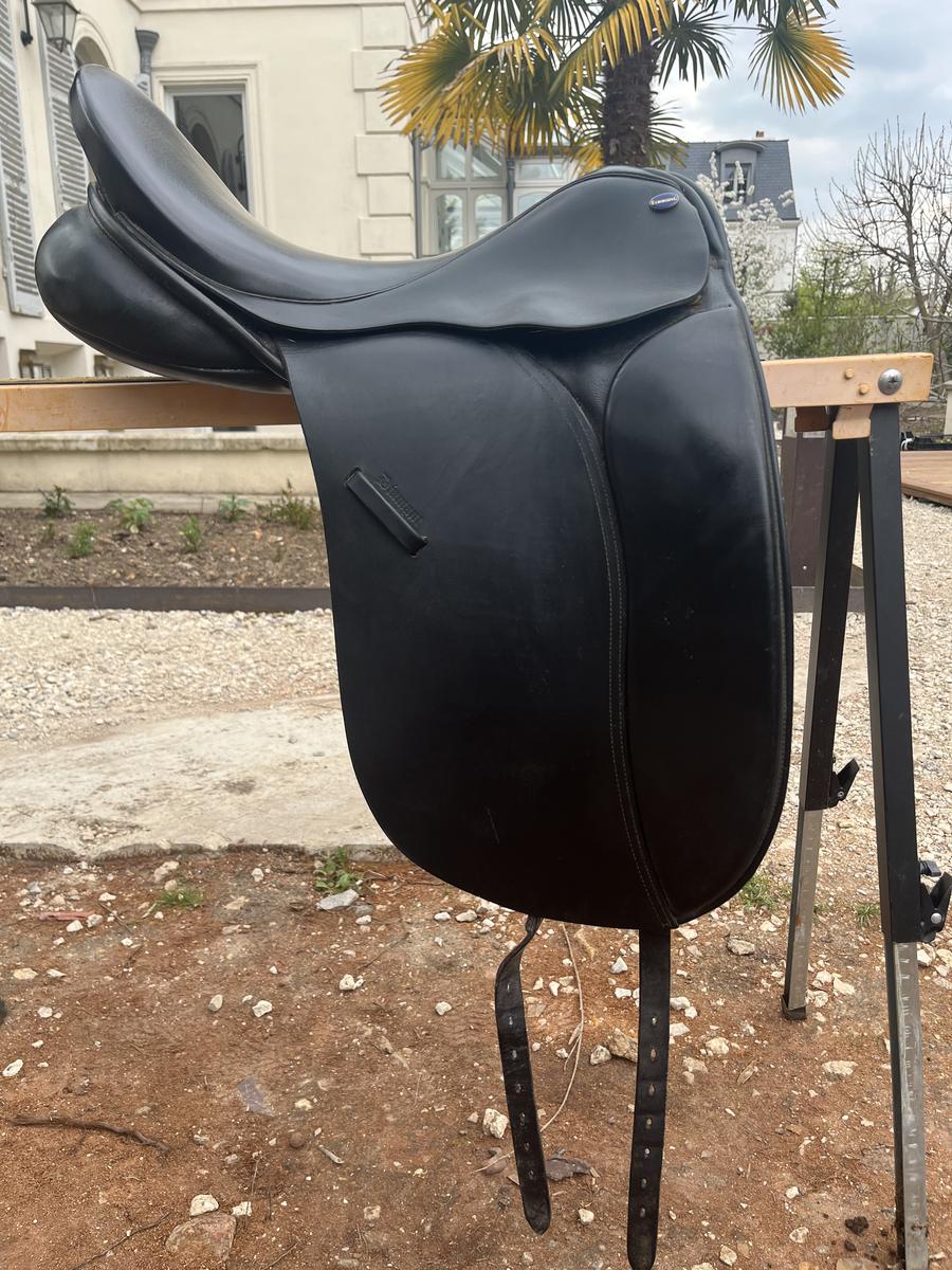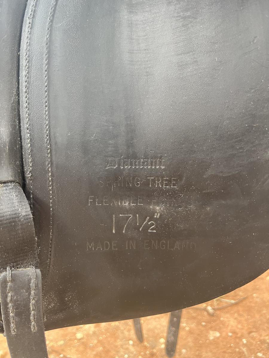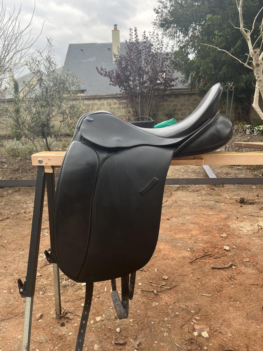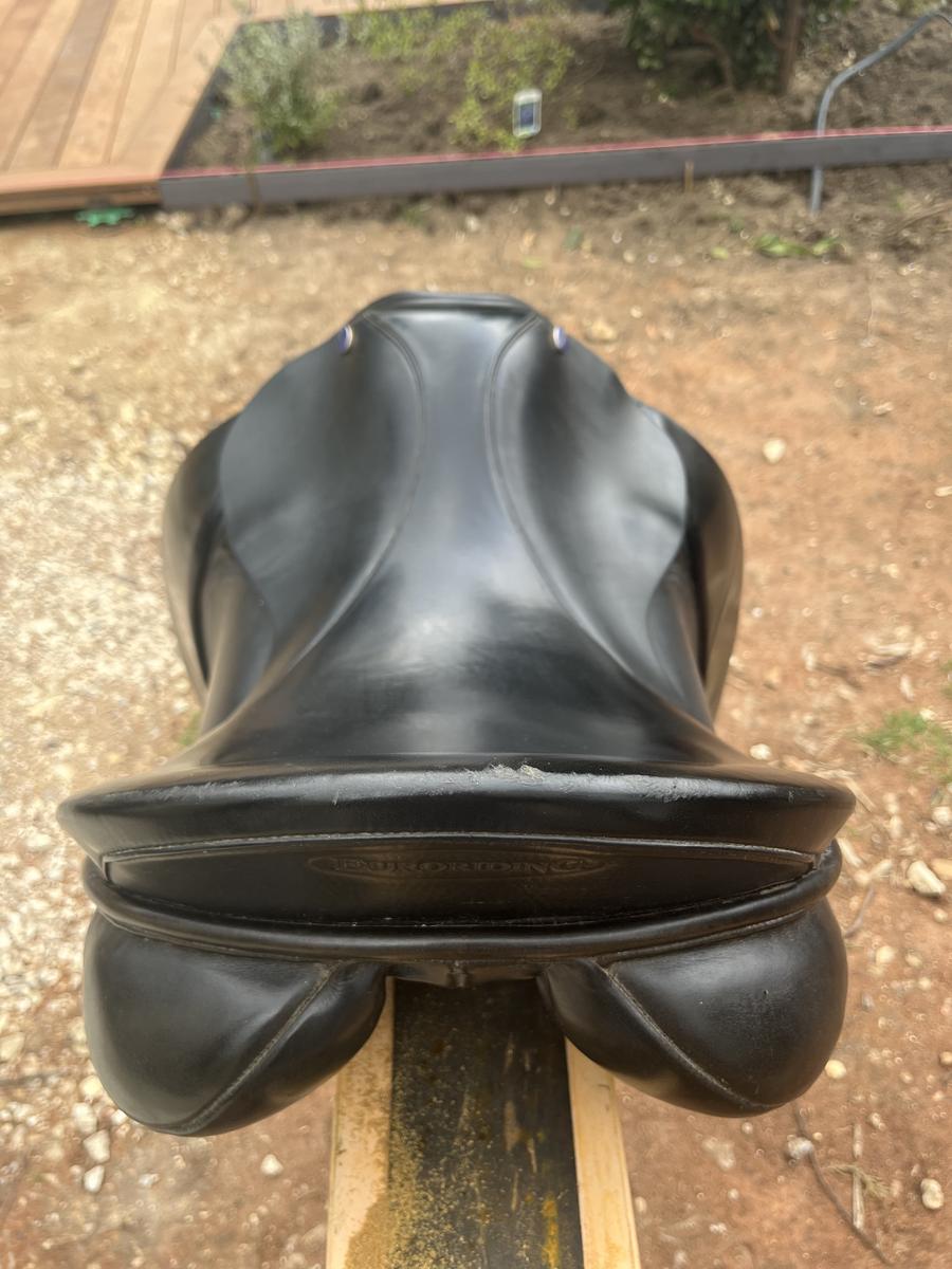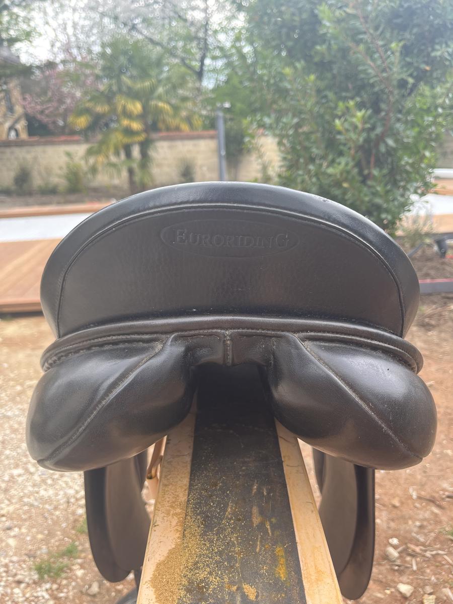 Selle 17,5" Euroriding modèle Diamant, pas neuve mais très bien entretenue, matelassures et coutures impeccables. Une griffure sur le troussequin visible sur la photo. Quartiers longs. Selle portée par un jument selle français toisant 1.66. Vendue avec ses étrivières.