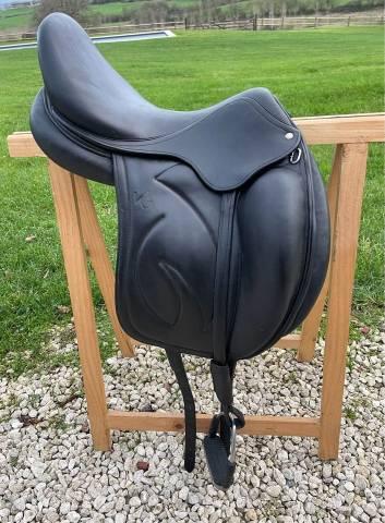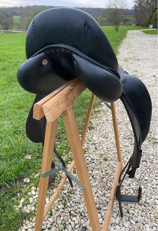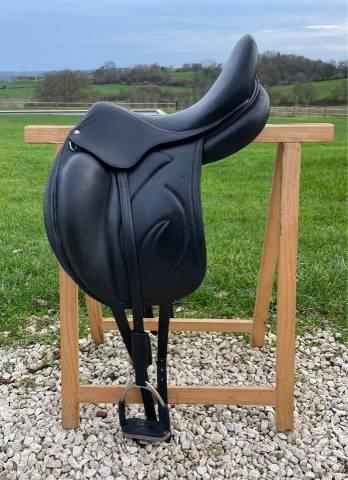 Vends selle de dressage noire 17 pouces fabriquée par Vincent Gaffet, artisan sellier haut de gamme.