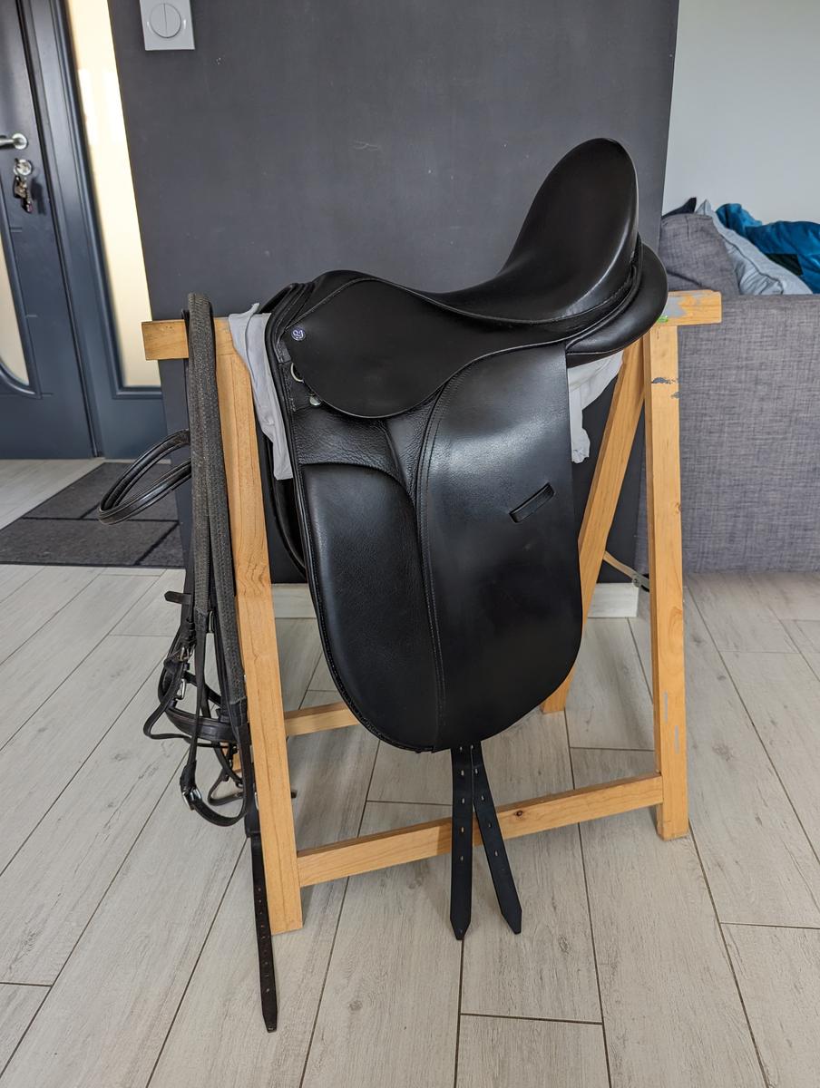 Vends ensemble selle de dressage de la marque Quadrije de Julie Noiret en 17,5 pouces avec son filet.