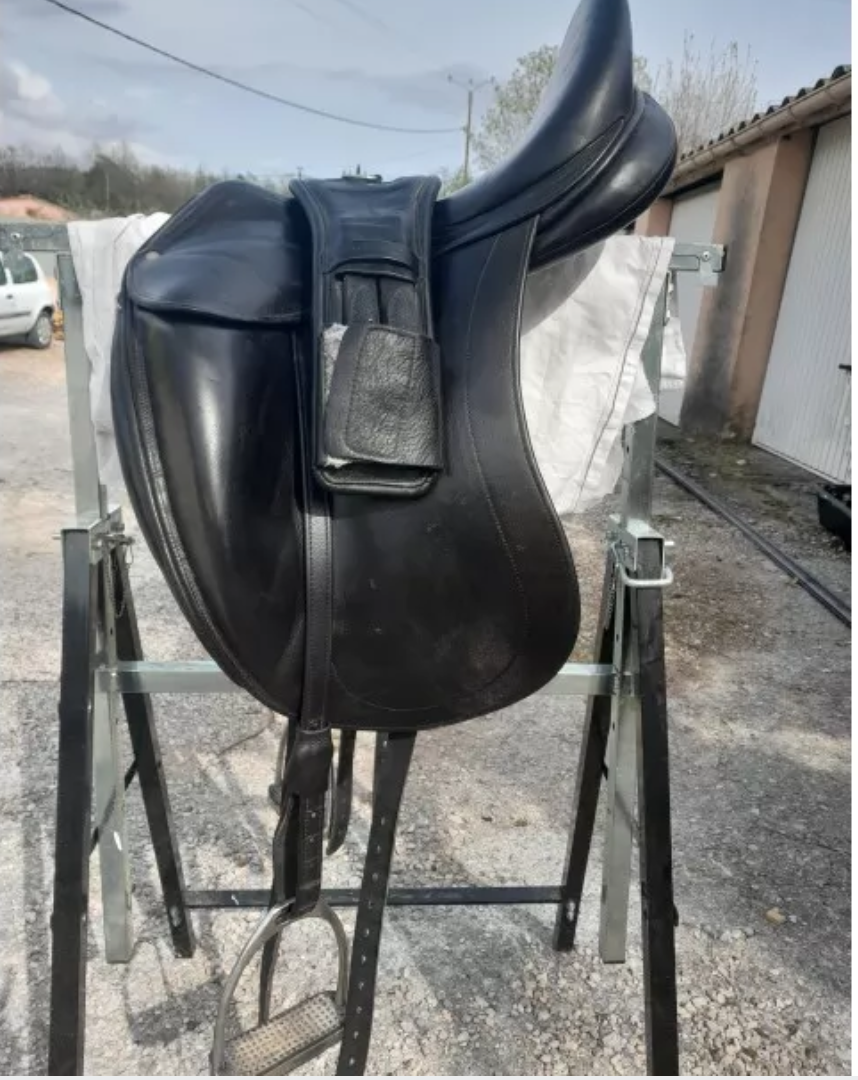 vendue équipée: sangle de dressage childéric, étrivières childéric , housse childéric et étriers de dressage.