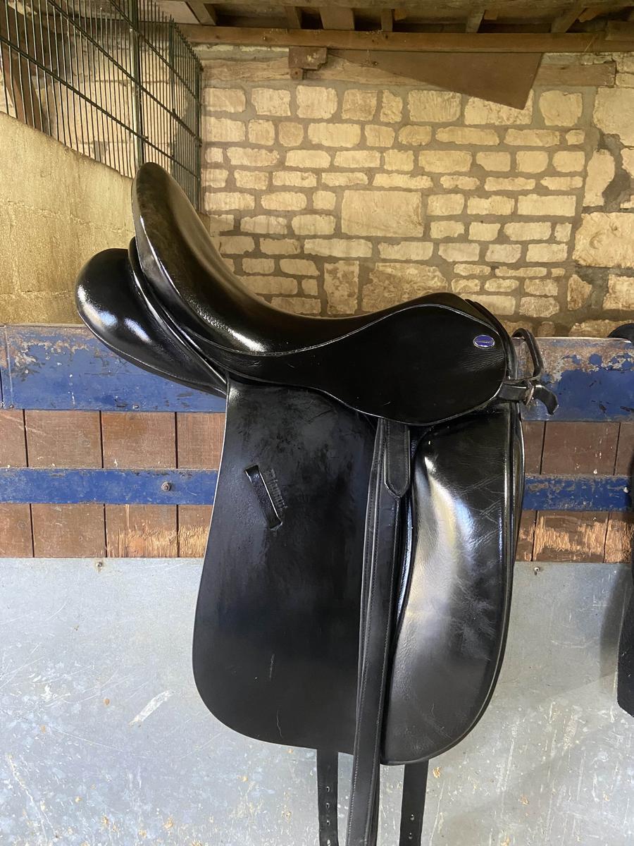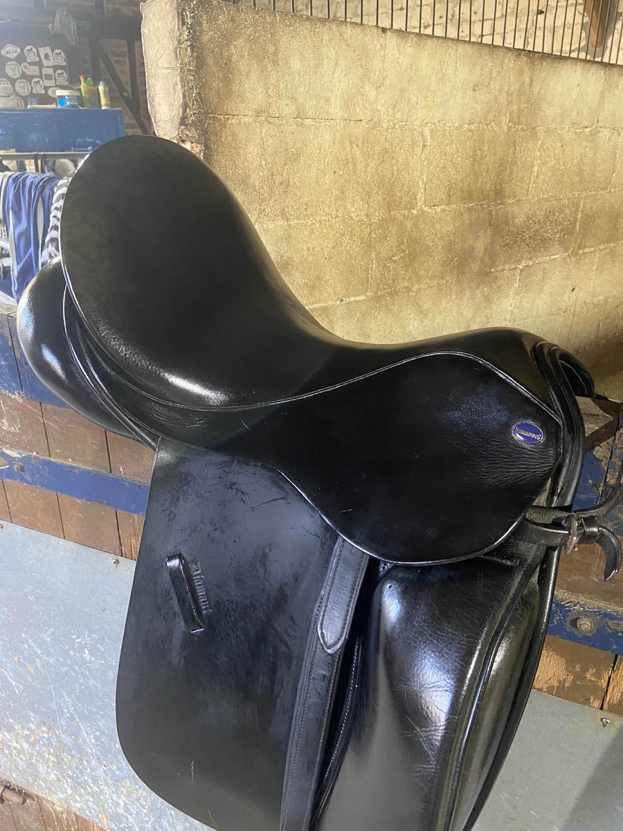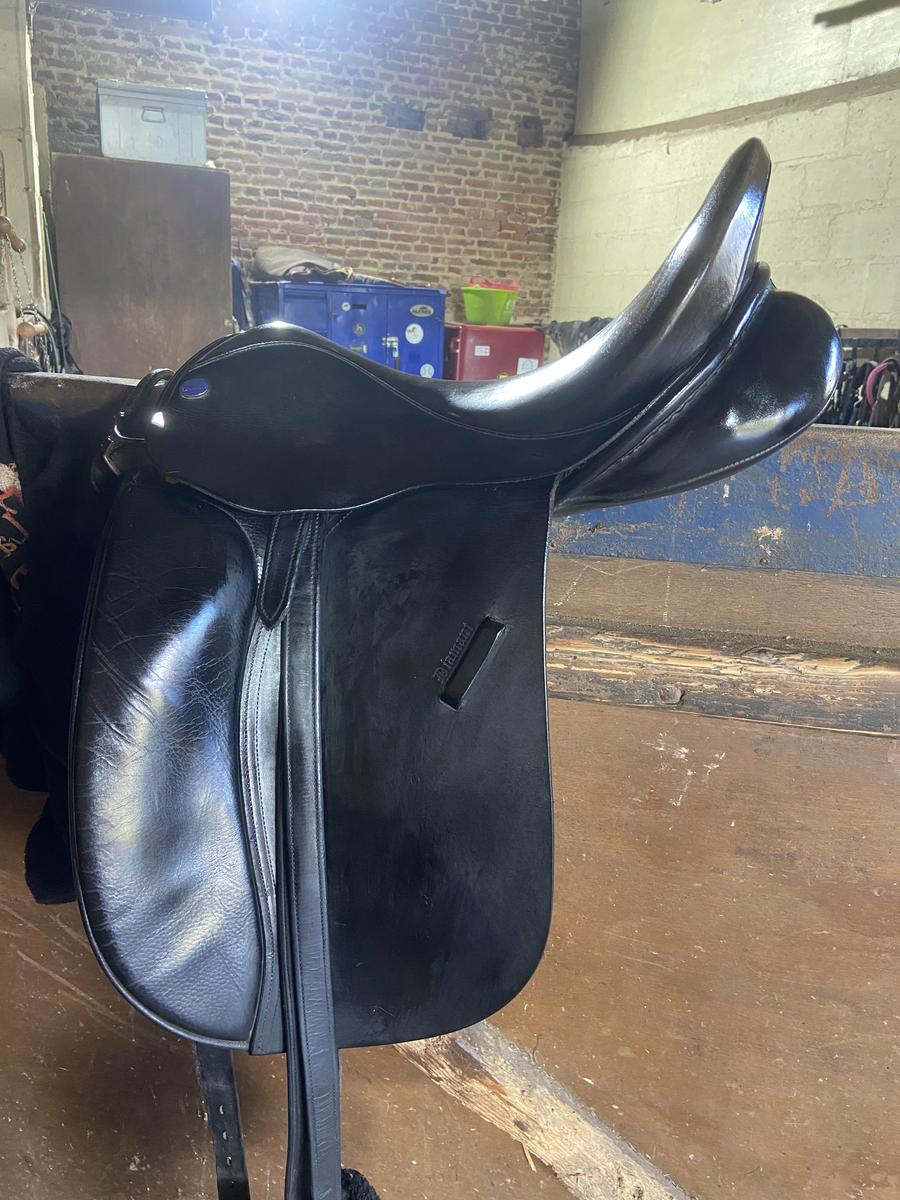 bon état, le cuir est légèrement déteint sur le trousquin, mais le cuir n’a pas d’accro, la selle n’est pas abîmé.