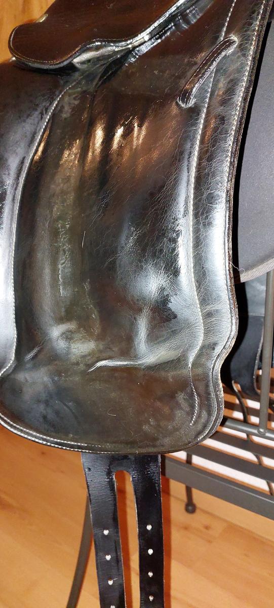 Première selle de dressage Devoucoux. Siège et sanglons refait à neuf. Vu son âge...bon état. Quartiers usés mais recollés par cellier. Arson ok. Correspond à taille 165 cm
