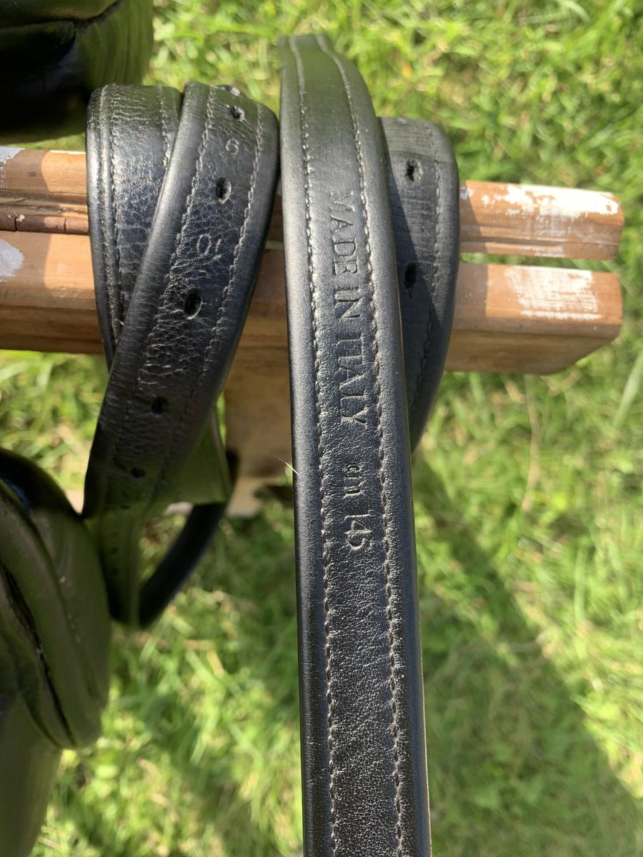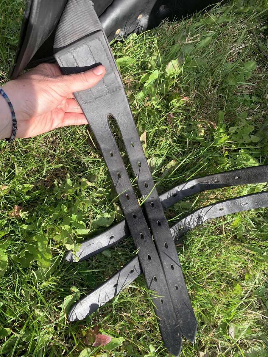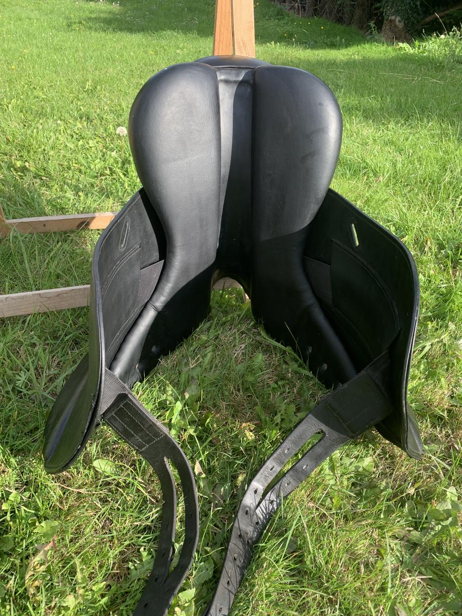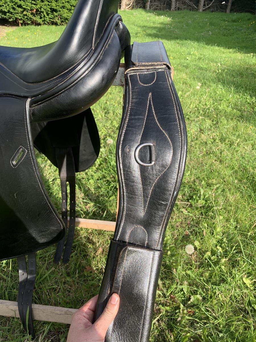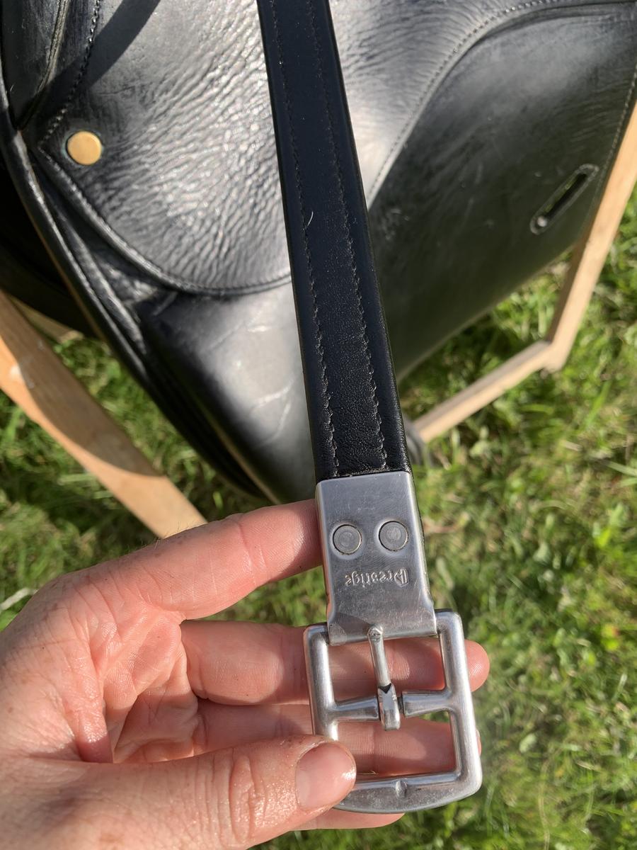 Vendue équipée d’une sangle en cuir noire 55 cm et étrivières prestige 145 cm, excellent état. Possibilité de l’équipée d’étriers.