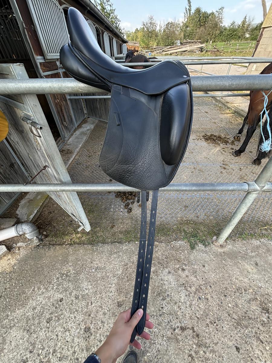 Je vends ma selle de dressage Custom Icon Alpha, taille 17.5 pouces, en cuir Buffalo noir, avec quartiers longs.