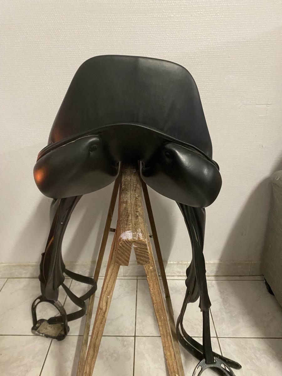 Selle de dressage noire Jean Luc Maurel taille 18 de 2012. En très bon état, toujours très bien entretenue et utilisée occasionnellement.