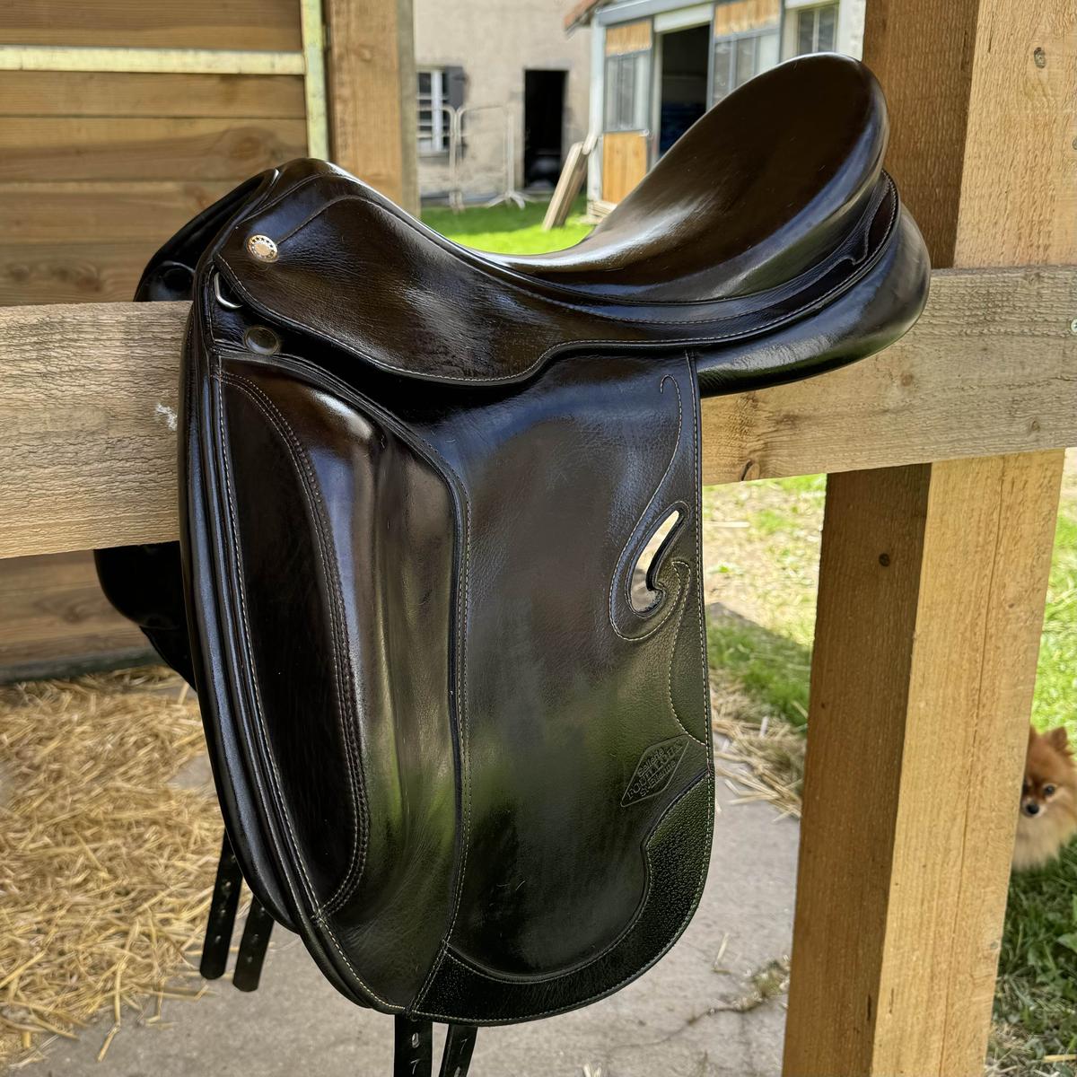 Selle de dressage mono-quartier de la marque Prestige, modèle « passion K », édition spéciale en collaboration avec la sellerie Fouilloux à Saint-Etienne.