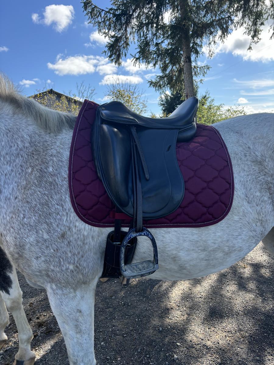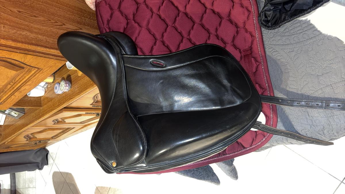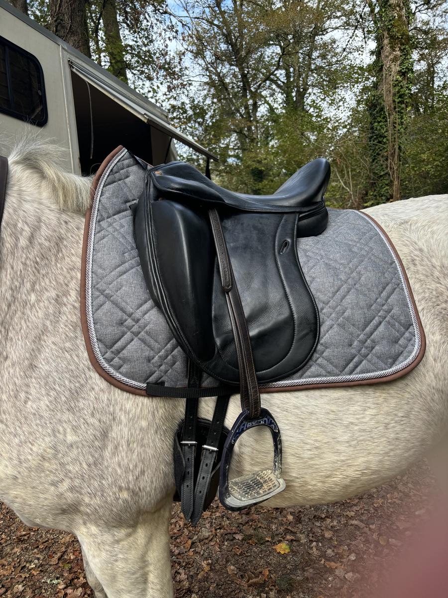 Je vend ma selle de dressage car elle ne convient plus à mon nouveau poney, elle est très bien entretenu n’a que une légère trace d’usure au niveau du passage d’ étrivière c’est un siège 17"