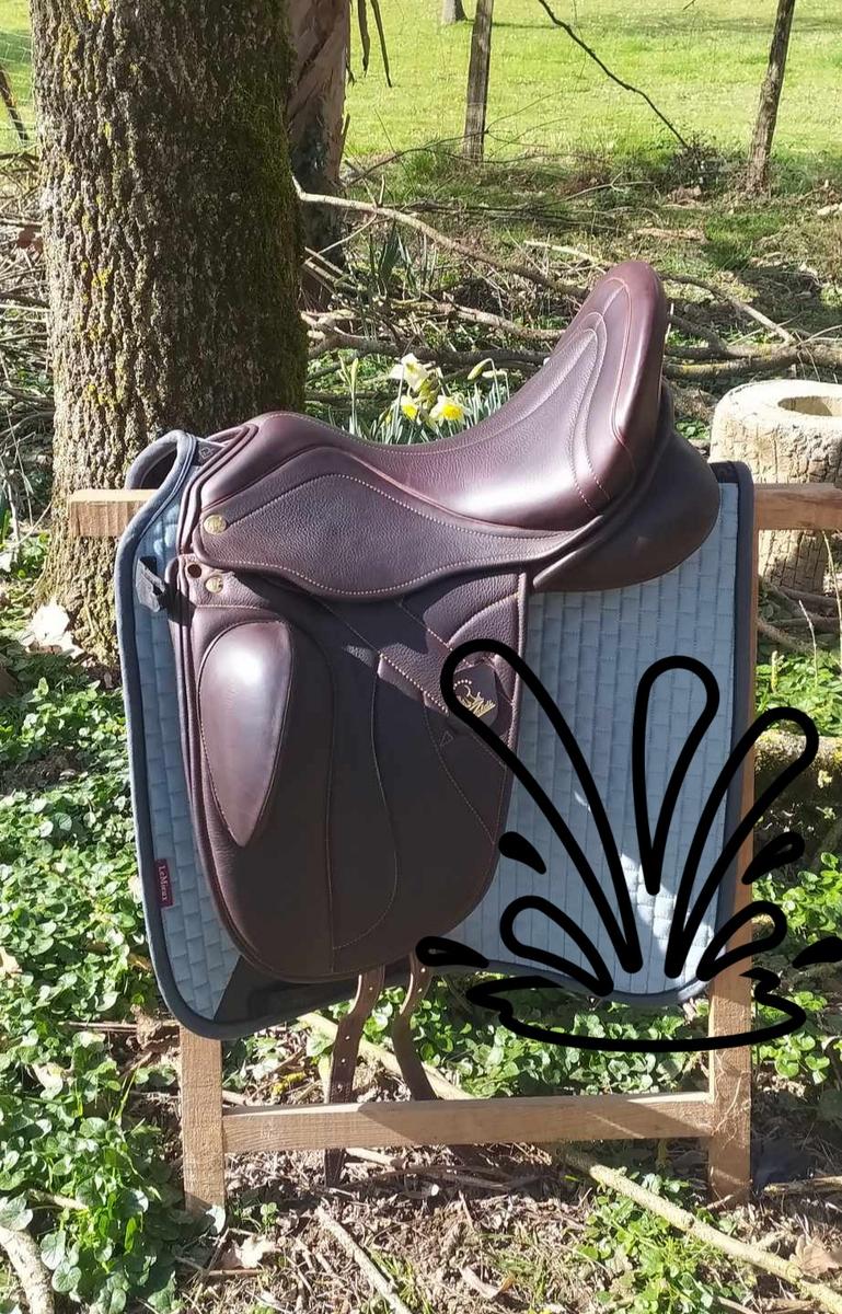 Selle vendue nue mais possibilité de vendre également la sangle assortie Zaldi modèle Jessica 70 cm (oct 2024) et les étrivières assorties monobranches cuir/nylon taille M (jamais utilisées)
