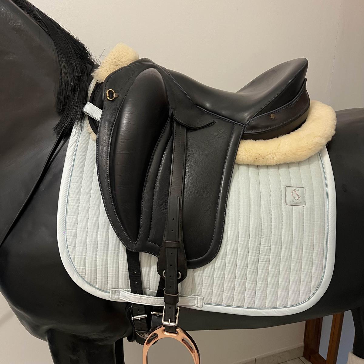 Bonjour, je vends une seule Gaston Mercier, Doline II : en cuir et très légère ! Vendu complète avec la sangle (65cm) et les étrivière plate . Selle de dressage très confortable Couleur noir Siège demi creux Taille de siège 17,5 Des quartiers longs et matelassés, des taquets enveloppants et un siège profond, ce modèle est conçu pour vous positionner sans vous bloquer. Les taquets avants ont été légèrement reculés et de ce fait fixent la jambe dans une position plus verticale et plus «descendue». Légère, grâce à son arçon en carbone (en option), la Doline II vous place très près de votre cheval, c‘est la synthèse parfaite pour les amateurs de dressage dans le respect de la locomotion du cheval. Points Forts de la selle Doline II • Vous positionne idéalement pour le dressage sans vous bloquer le bassin • Améliore et favorise votre verticalité • Proximité avec votre cheval grâce à la doublure veau sur la selle et à son arçon sportif • Maintien votre jambe sans contrainte • Débloque le cheval dans ses épaules et son garrot • Permet de retrouver les allures naturelles de votre cheval • Légèreté inégalée pour une selle de dressage Spécifications Techniques Taquets enveloppants Monoquartier pour favoriser le contact et la légèreté Suppression du petit quartier pour favoriser le contact Sanglage bas en V Portes étrivières avancés Arçon composite fibre de verre garanti 10 ans Siège tendu et sans jointure Poids moyen : 4.4 kg 5 catégories de Cuir bovin local et Français pleine fleur double tannage, garanti 2 ans Visserie inoxydable Portes étrivières crochets en acier inox, découpés dans la masse Mousses hautes densités indéformables Prix de vente neuf sans équipement 3670€