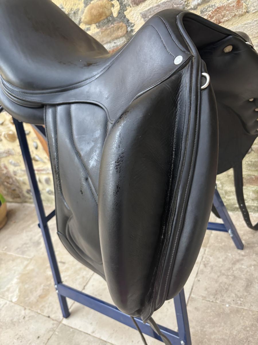 Selle de dressage Antarès Cadence mono quartier sanglage en V, fabrication 2011, modèle haut de gamme au cuir souple et parfaitement entretenu.