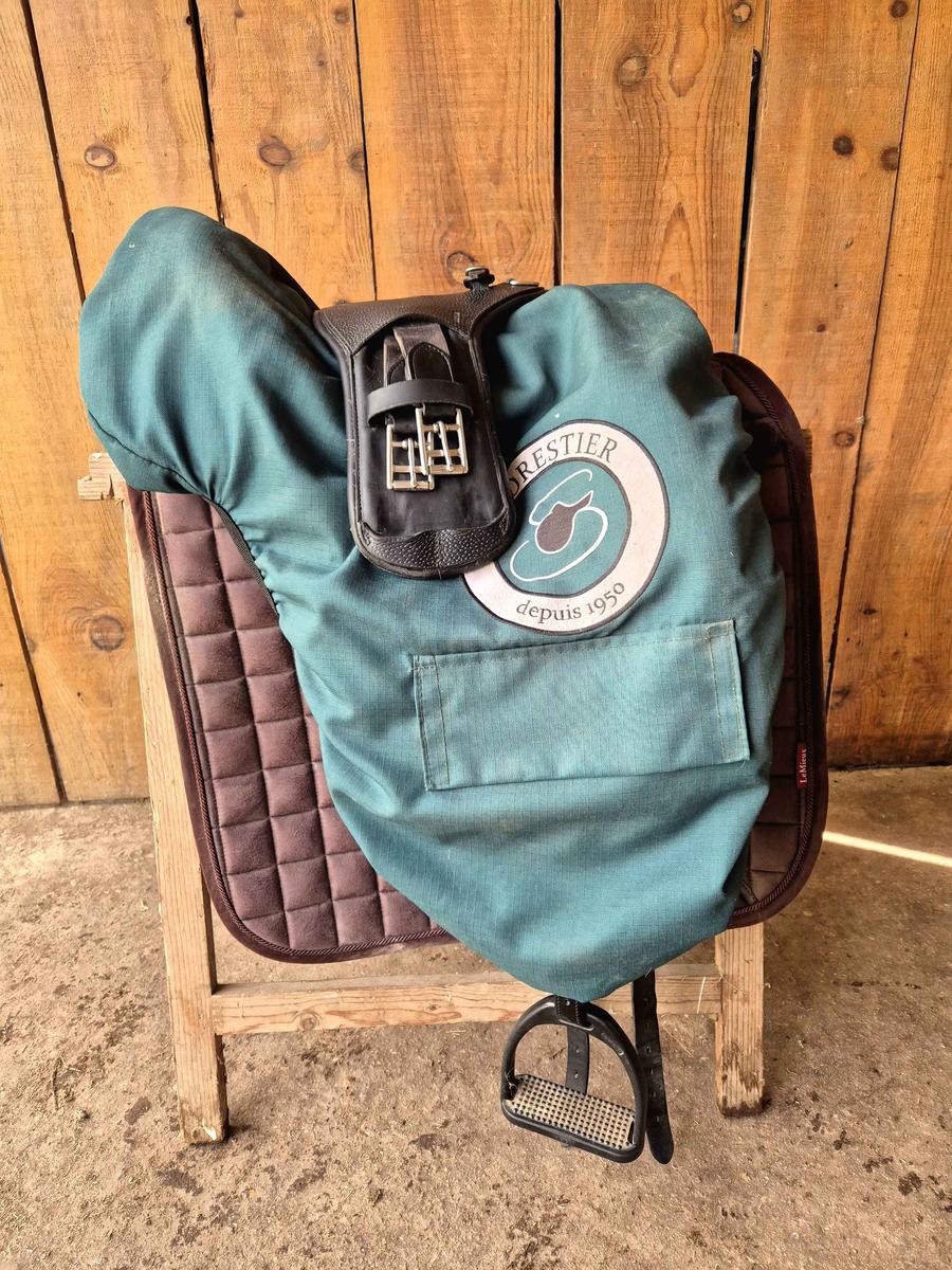 Je vends ma selle de dressage Aachen II de chez Forestier, modèle monoquartier, en cuir de buffle, gamme Pro. Année : 2021 (facture à l’appuie) Taille siège : 16,5 pouces (je mesure 1m64 pour 51 kg, pour repère). Arcade : standard. Taquets : petits taquets 1L. Léger rehaussement de 10 mm à l’avant et à l’arrière, idéal pour les chevaux au dos sensible. Excellent état, très bien entretenue. Je vends la selle avec : - Une sangle courte confort Forestier (50 cm). - Des étrivières de dressage taille S (pour cavalier(e) de 1m55 à 1m70). - Sa housse de protection Forestier. Je la vends à regret, car elle ne convient plus à la morphologie actuelle de mon cheval. 📍Selle visible sur demande (Dordogne et alentours) / remise en main propre. 💶 Prix 2300 € négociable