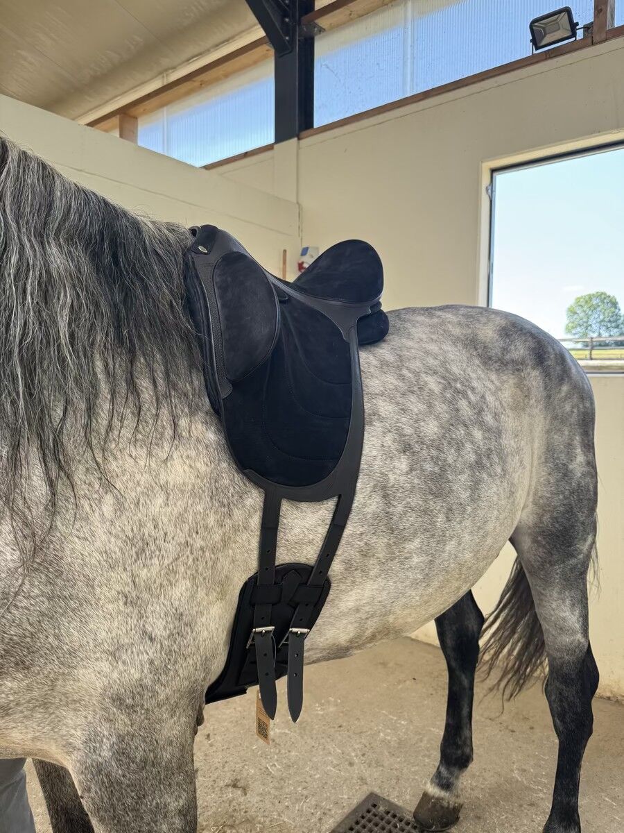 Achetée toute neuve chez Devoucoux en Juin 2025 personnalisée avec liserés swarovski noir, sangle, étrivières, housse et produits d'entretien.