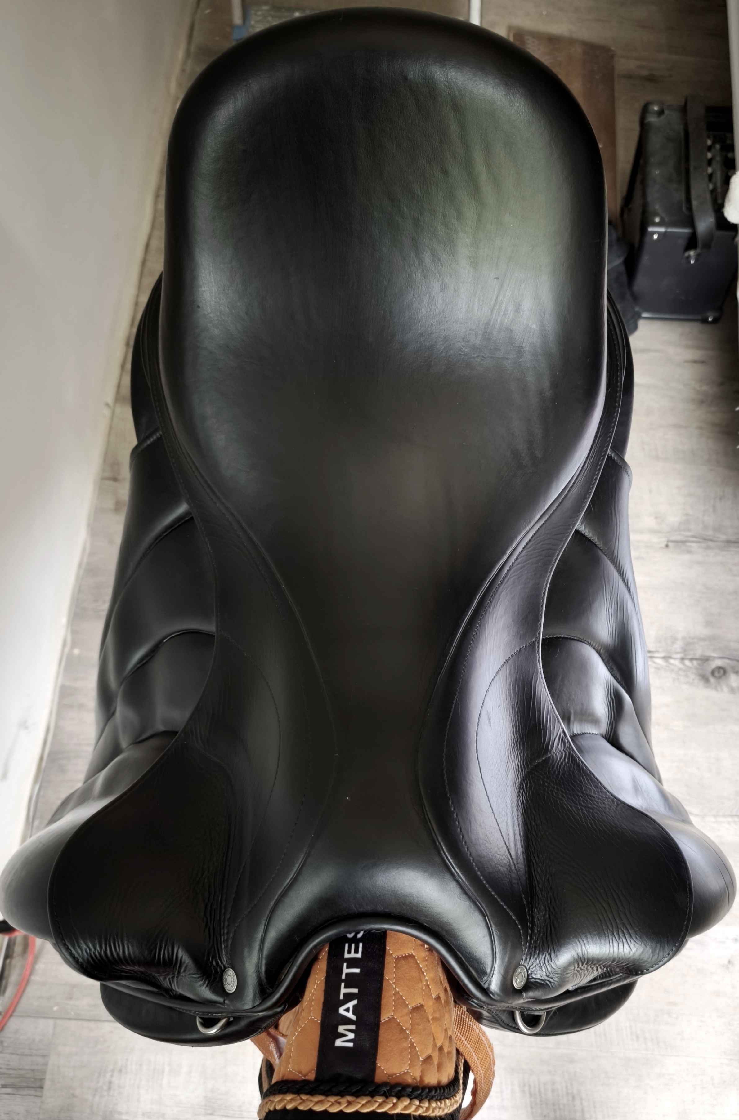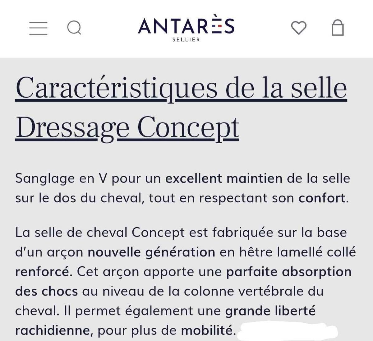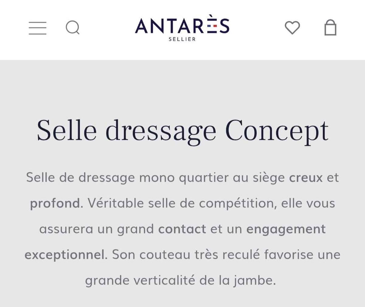 Selle de dressage Antarès Concept taille 18", quartiers 4R, siège creux, monoquartier, très confortable.