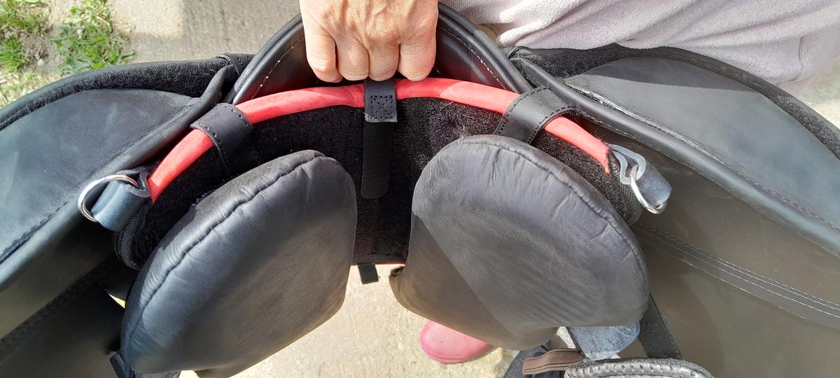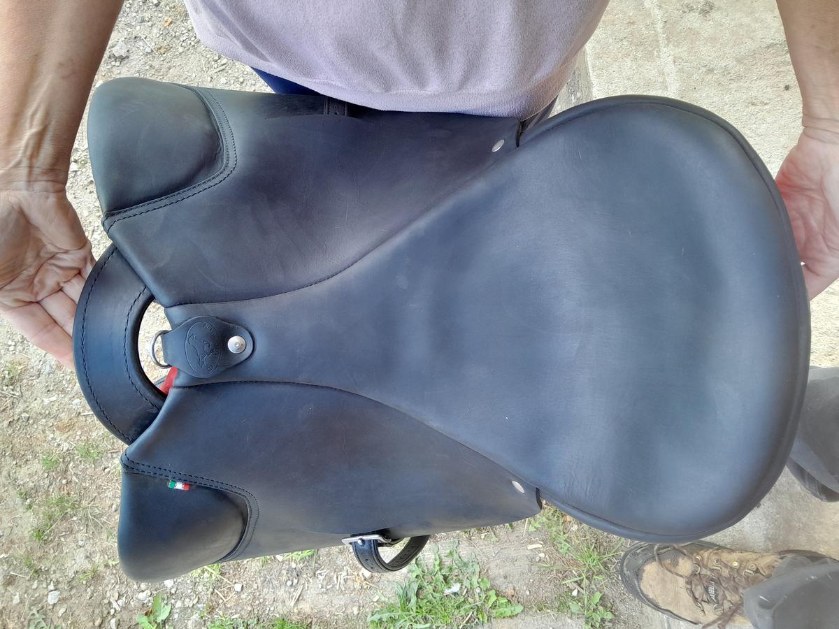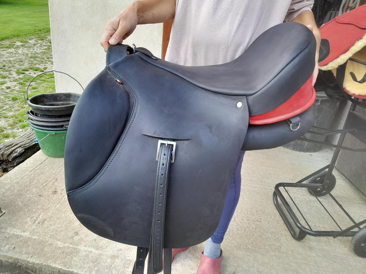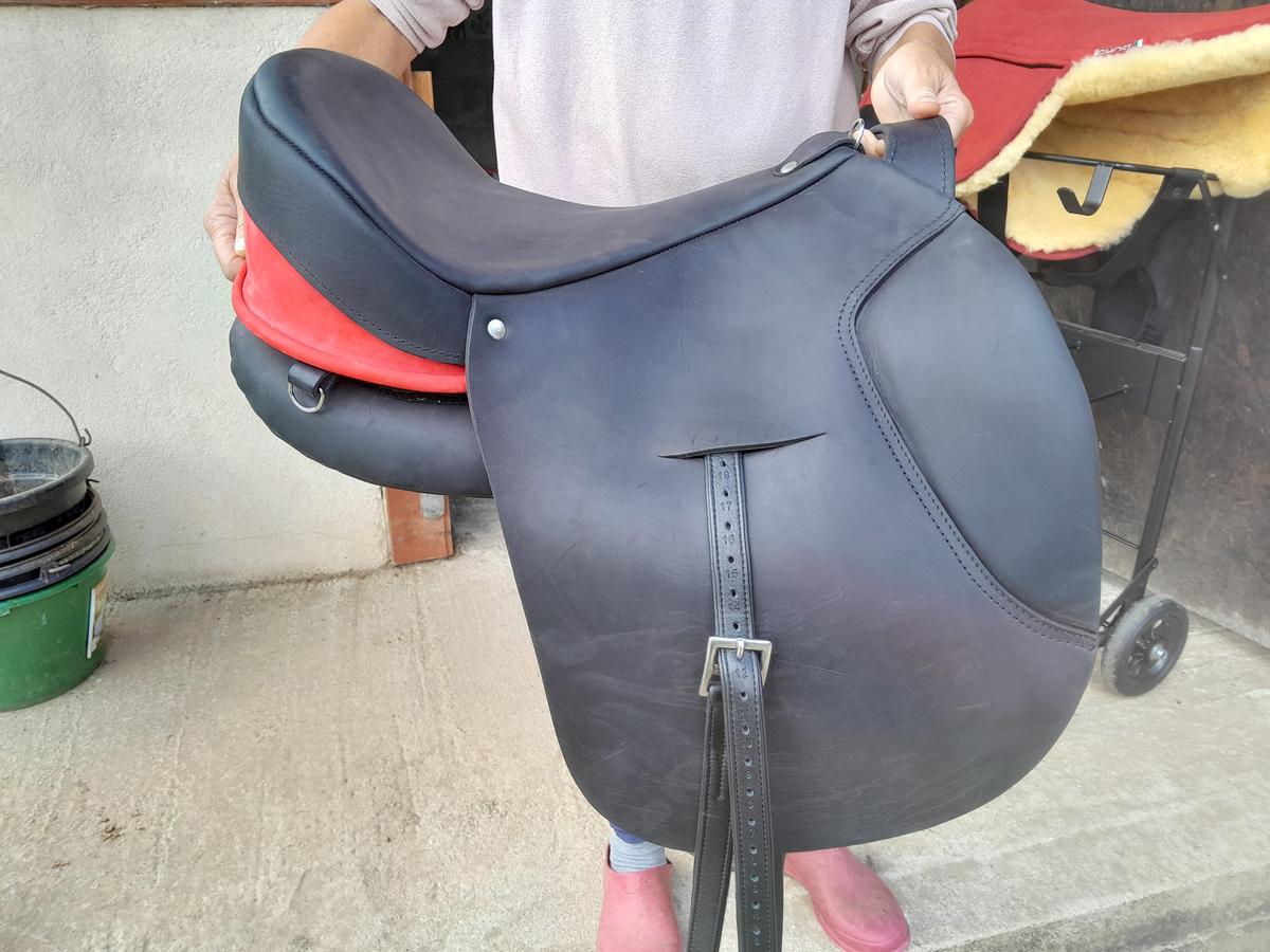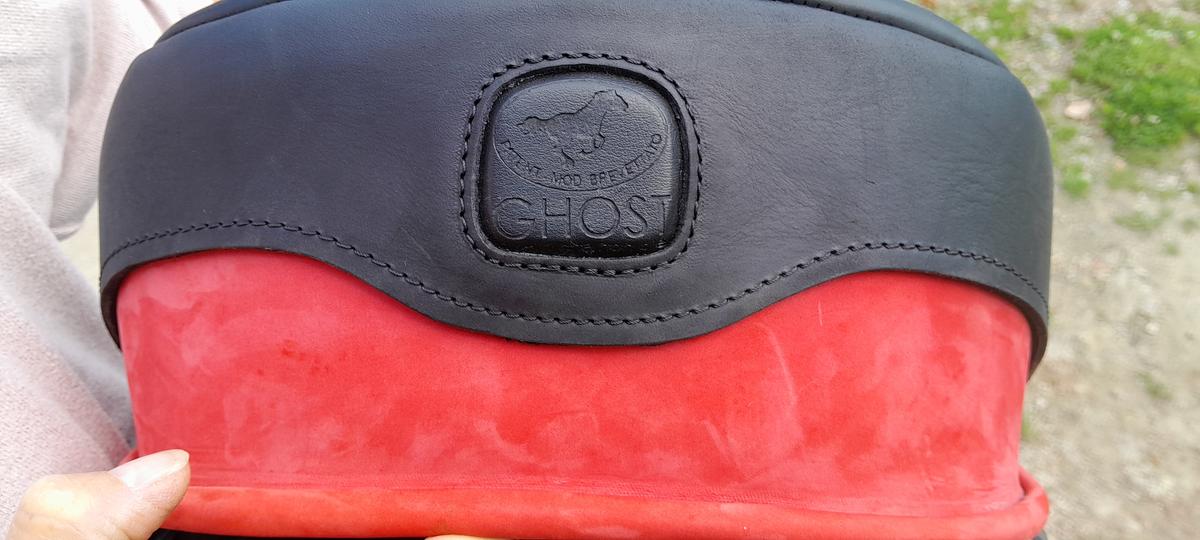Selle Ghost Modèle Torino en cuir noir et rouge, Taille Piccolo (17"), avec son tapis physiologique de la même marque en peau de mouton véritable