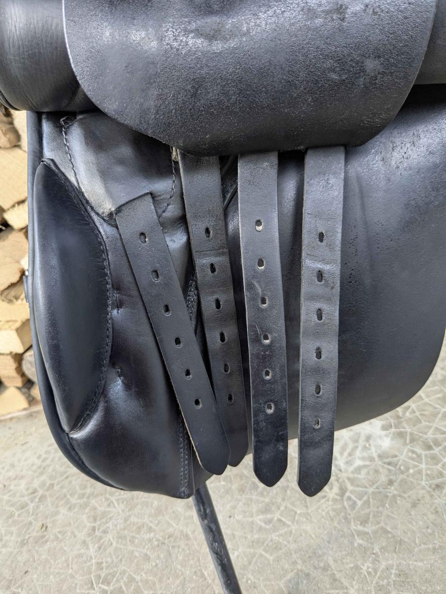 La selle est en bon état, avec quelques petits signes d'usure superficiels, notamment quelques décolorations sur le siège (comme visible sur les photos). Le siège fait 18 pouces (le minimum pour cette gamme), l'ouverture d'arcade actuelle est 31 (modifiable par un sellier). La matelassure a été renouvelée par la propriétaire précédente et reste souple et uniforme.