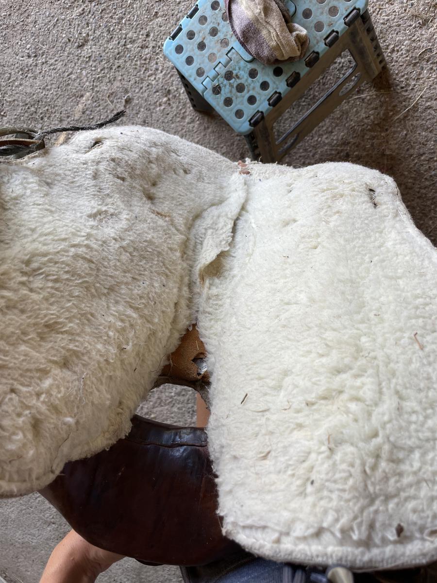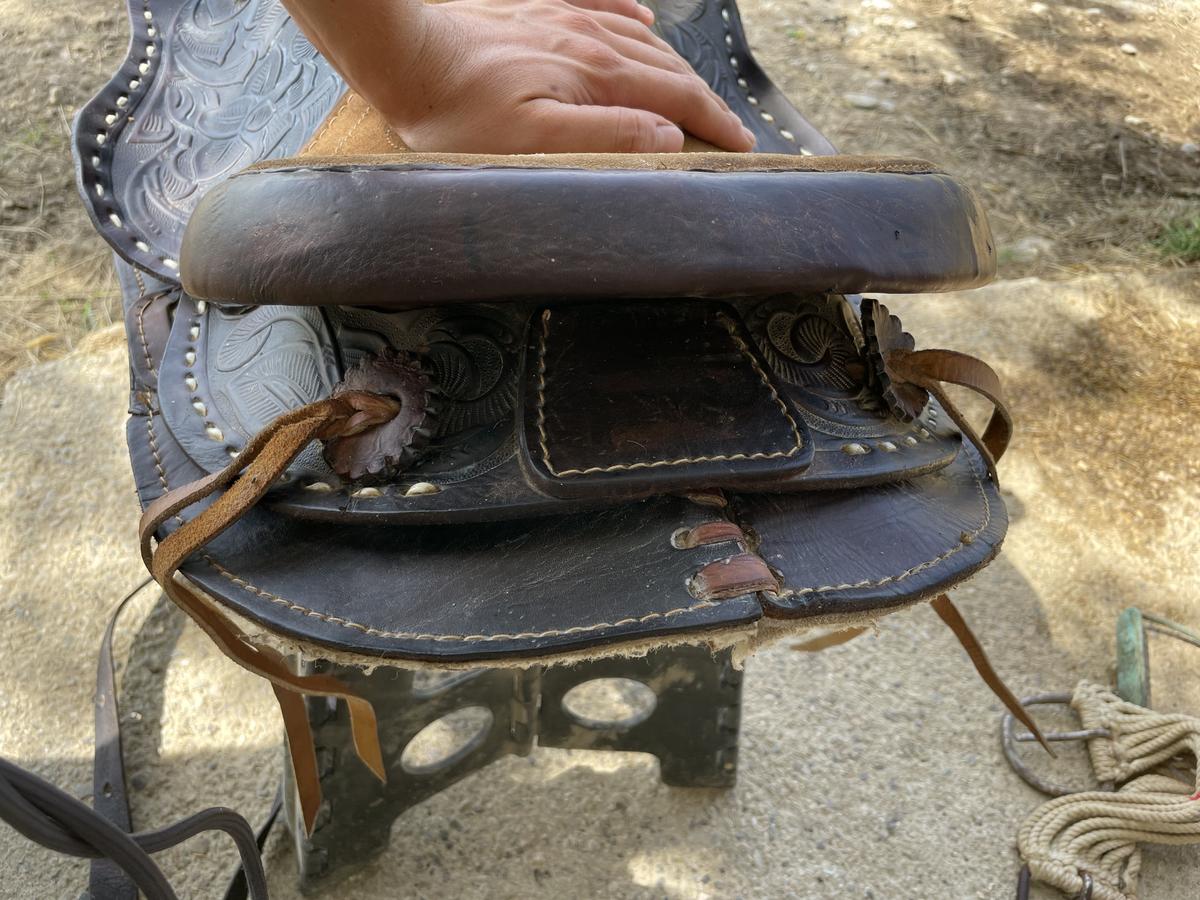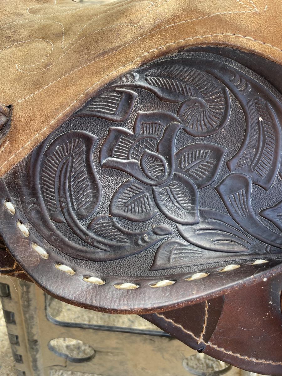 A vendre selle western en cuir et daim décorée avec le dessous en moumoute