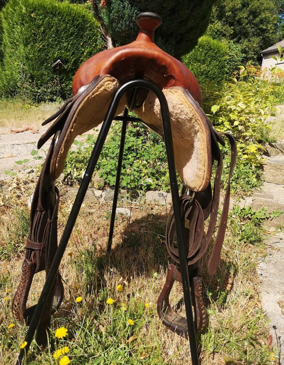 Selle western continental round skirt (dos court idéal) à vendre. Modèle rare, c’est une édition limitée, il n’en existe que 48. Arçon QH, bois recouvert de fibre de verre. Siège 15,5 pouces. Gullet 16 cm. Conchos 18 cm. 62 cm de longueur. Environ 15kg. Sanglage bas et croisé parfait pour les chevaux rond. Anneau arrière pour back cinch. Très confortable et top qualité. Essai possible uniquement sur secteur Rennes /ploermel.