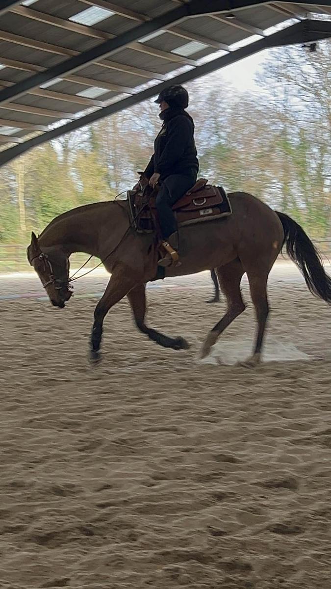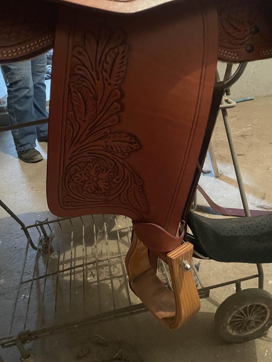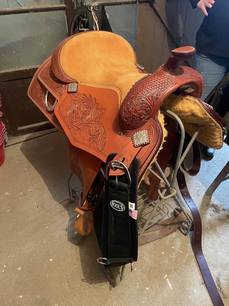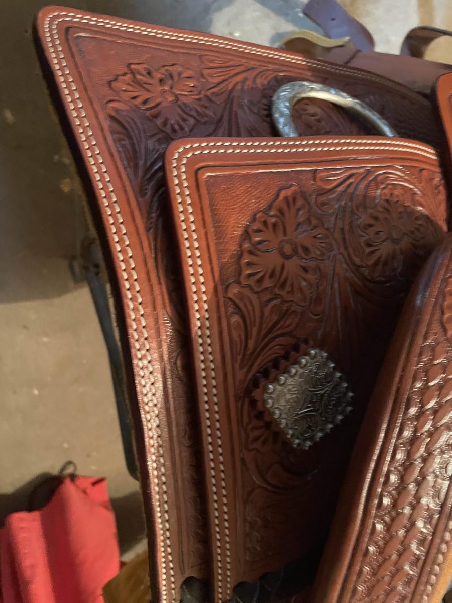 !!! Selle de reining de marque WESTERN ONLY, parfait état, full qh, taille 17", double padded Tan roughout seat, tooling half floral, square skirts, découpe close contact, square silver conchos, anneau arrière argent, 5 conchos sous le gullet, étrivières prétournées, sanglage in skirt.