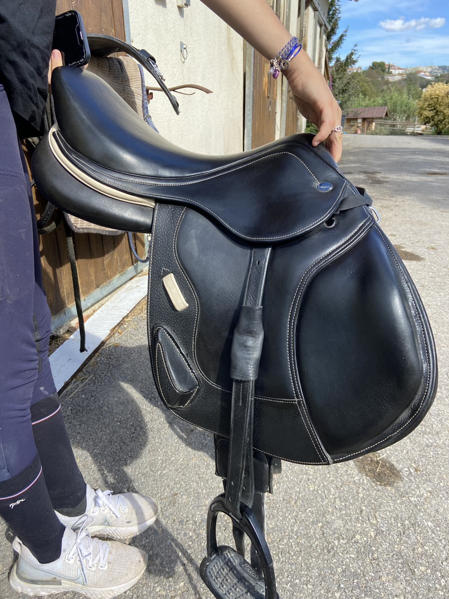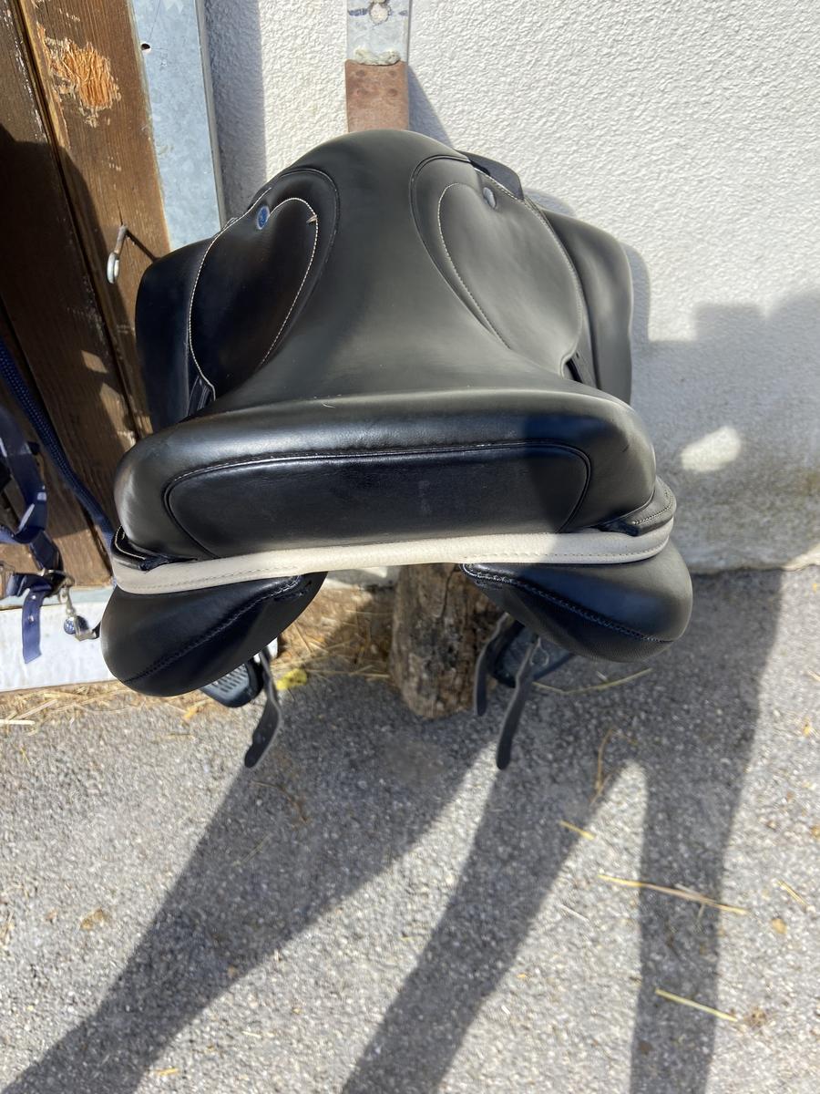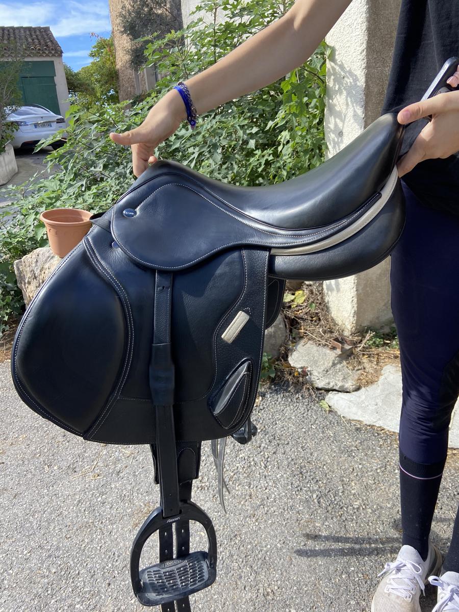 Une selle en très bon état. Elle est vendu toute équipée avec bavette étrivière et housse de selle. Je l’ai acheté en 2022 convient à tout type de cheval. Taille du siège de 16,5.