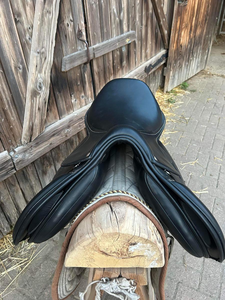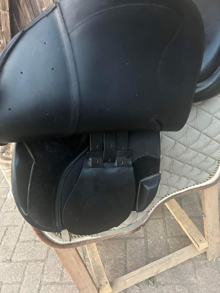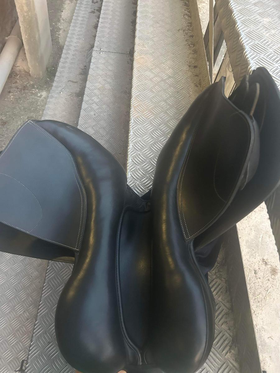 Je propose à la vente ma selle ERIC THOMAS modèle FITTER siège 17" Cuir noir grainé souple surpiqûres blanches, renfort aux passages d'étrivières
