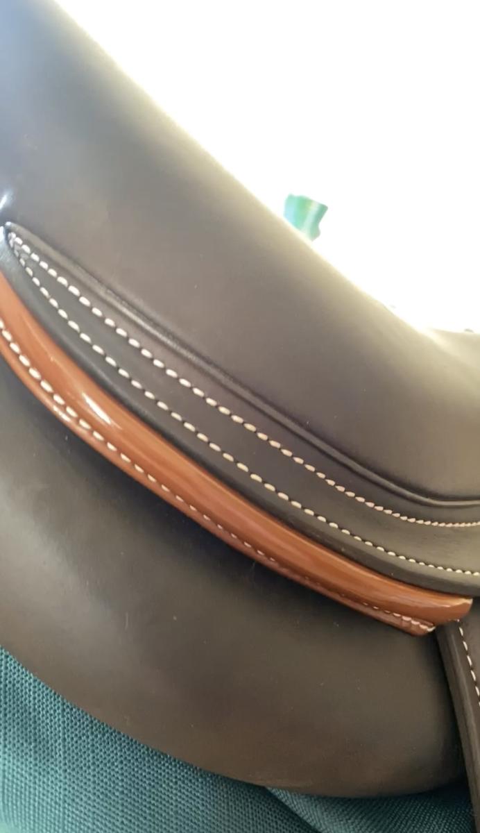 Selle NEUVE, en cuir de buffle marron avec un bourrelet marron vernis.