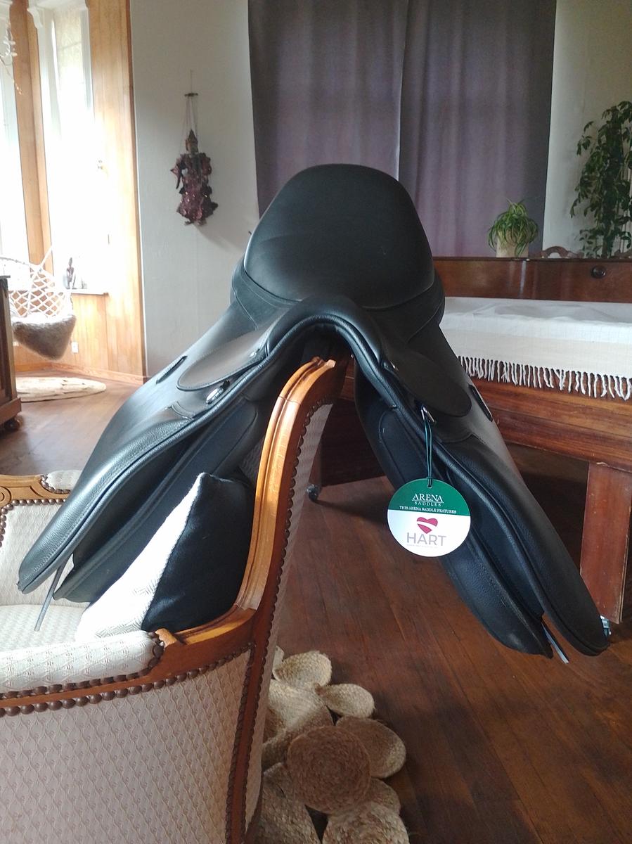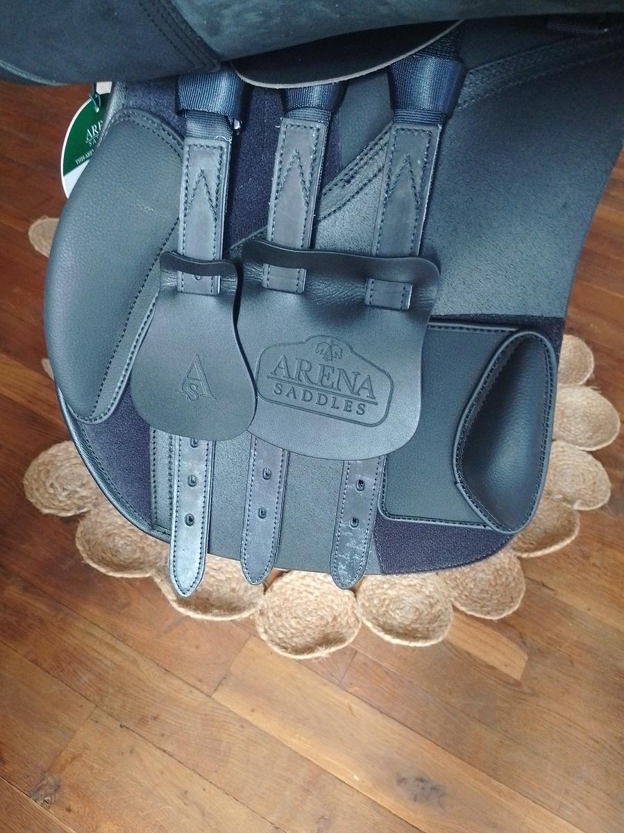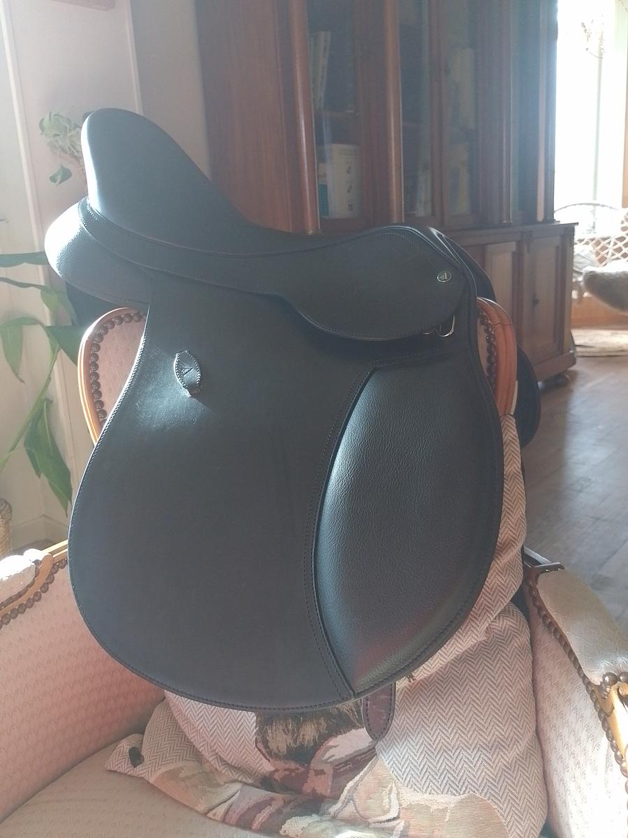 Bonjour, je vends ma selle noir mi cuir mi synthétique. C'est le modèle all purpose de la marque Arena. Je la vends par ce que elle ne convient pas à ma jument (je l'ai juste posée sur son dos).