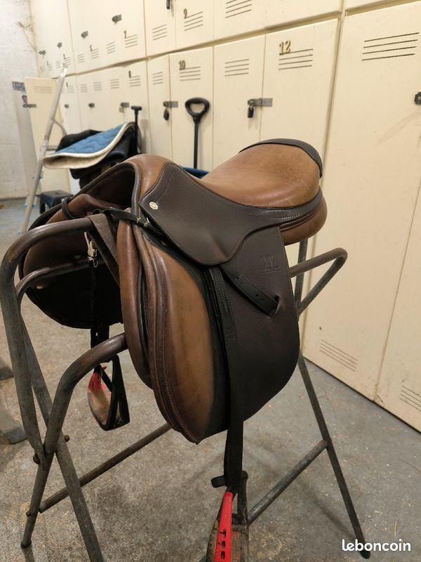 selle antares première main, taille 15.50 pouces. Vendu avec etrivière en cuir, etrier free jump enfant et sangle en cuir.