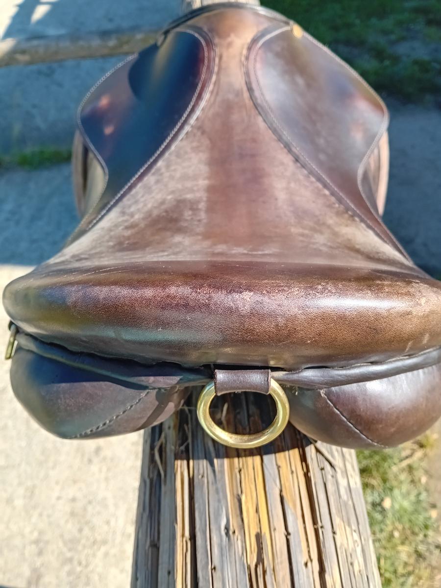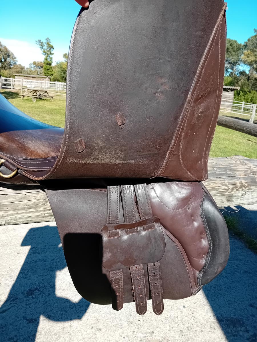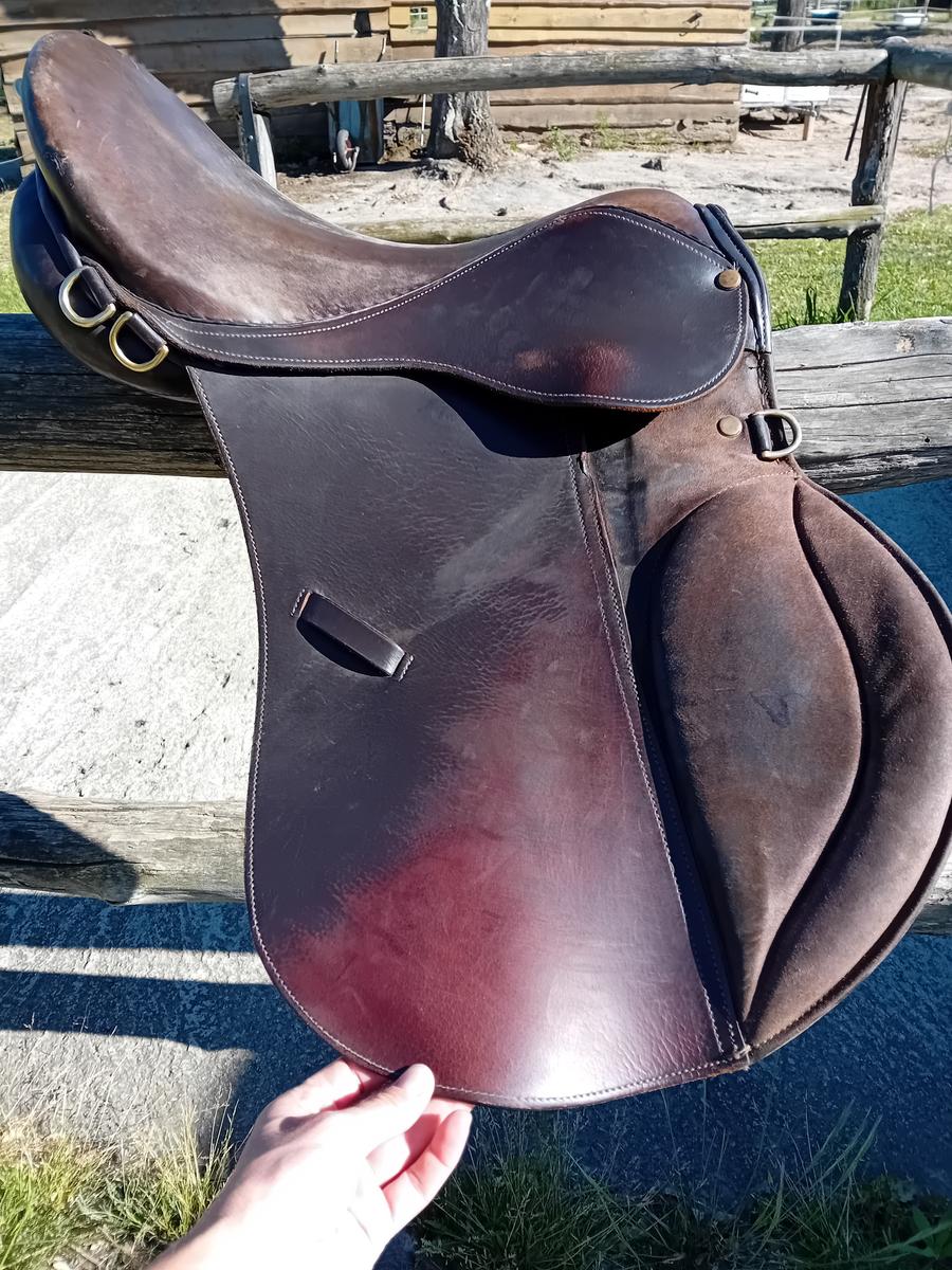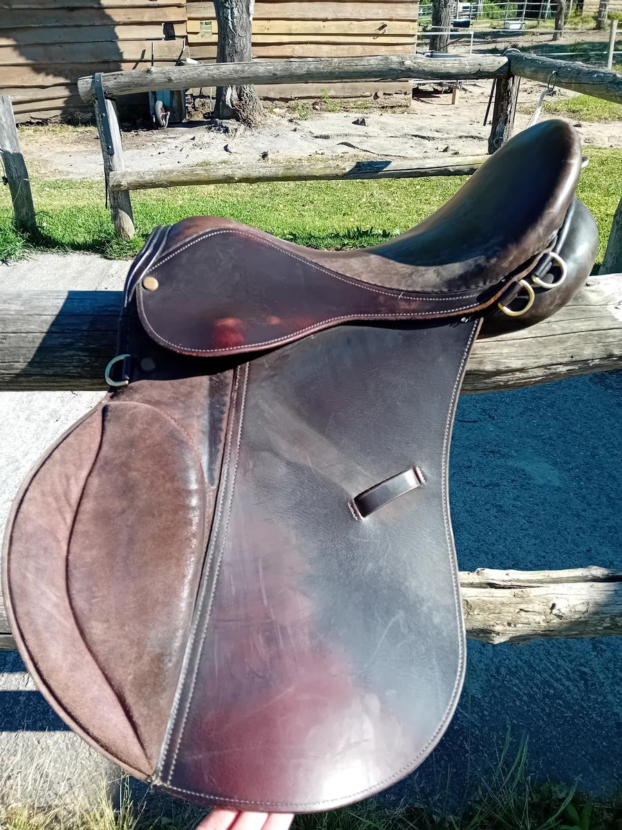 Selle mixte à tendance randonnée très solide, tout cuir. Nombreux anneaux d'attache. Marque inconnue, certainement artisanale.