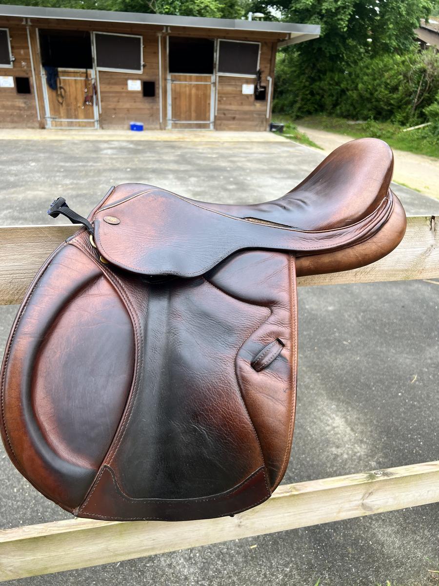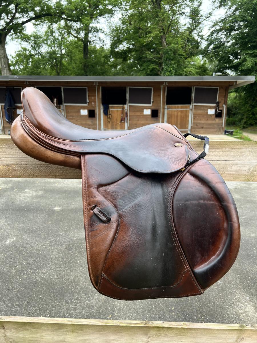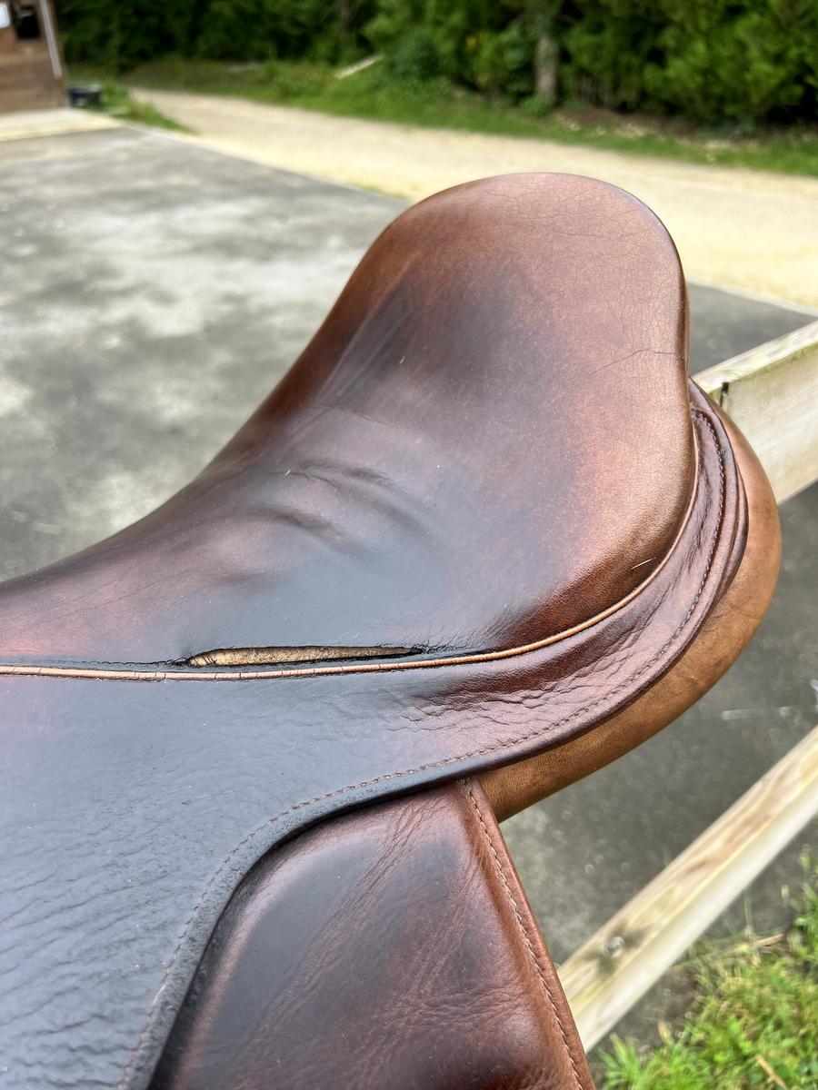 A vendre Selle de marque Eric thomas, modèle monaco, 17 pouces,marron, possibilité d’ajuster les cales par scratch au niveau de la jambe.