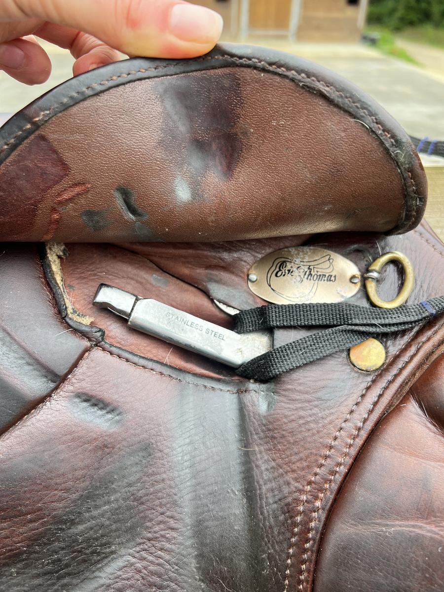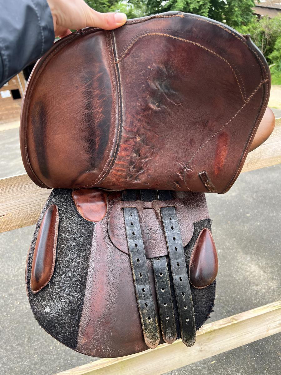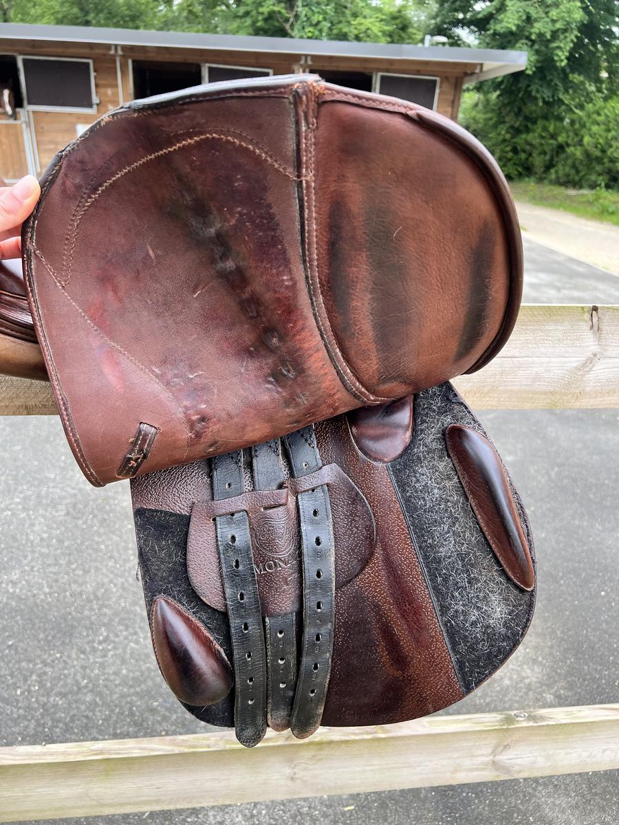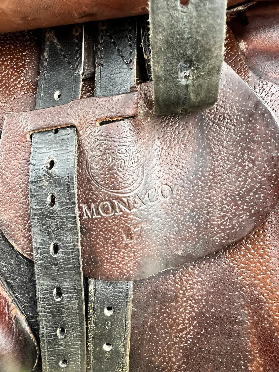 A vendre Selle de marque Eric thomas, modèle monaco, 17 pouces,marron, possibilité d’ajuster les cales par scratch au niveau de la jambe.