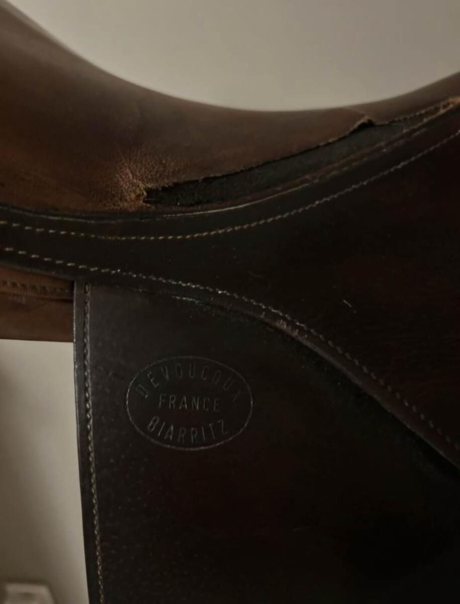 Bonjour, Je vends ma selle Devoucoux nue pour cause de changement de selle. Elle présente un défaut, le siège est décousu d’un côté (voir photo). Le défaut n’empêche en rien la monte et est juste esthétique. Vous aurez toujours la possibilité de faire réparer par un sellier/ bourrelier. Cuir marron de qualité Devoucoux. Petite taille (16,5 ou 17 pouces) N’hésitez pas si vous avez plus de questions !
