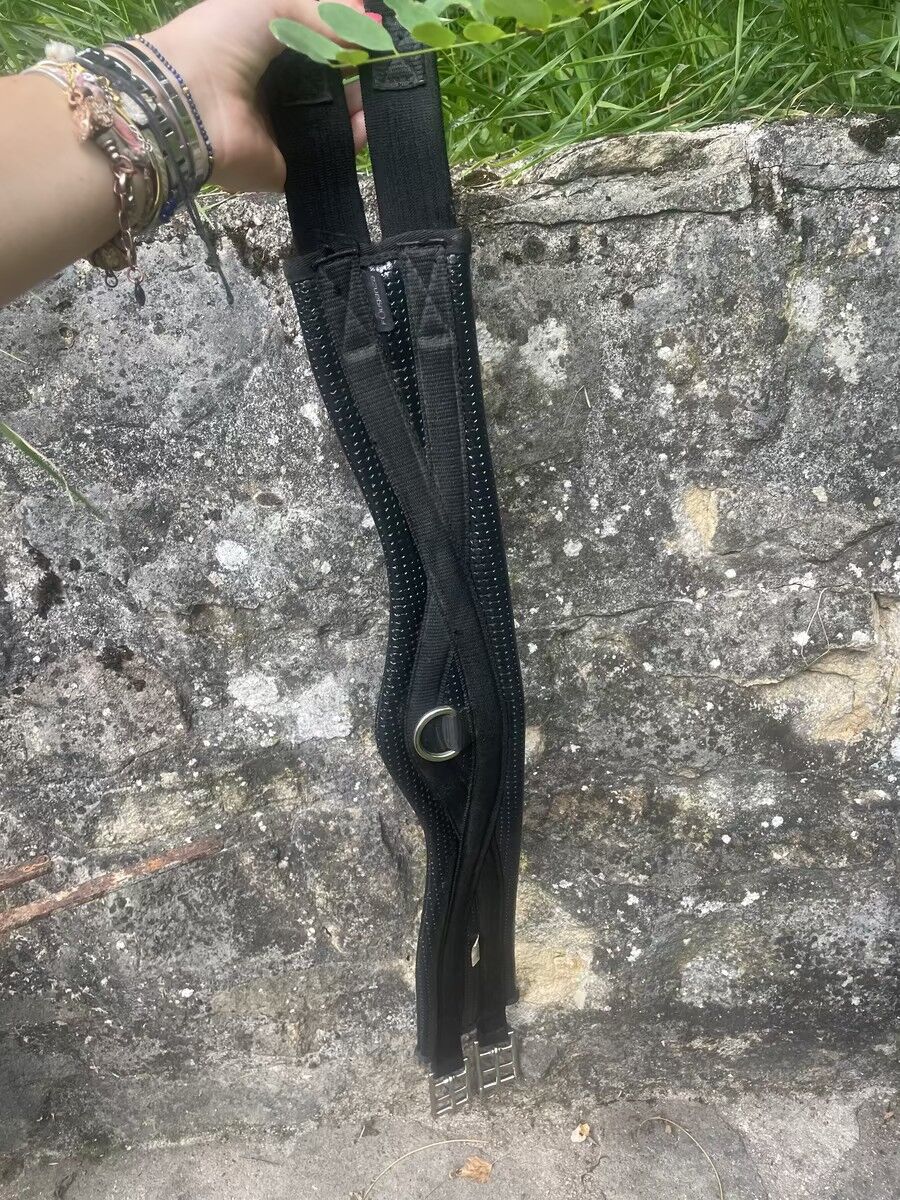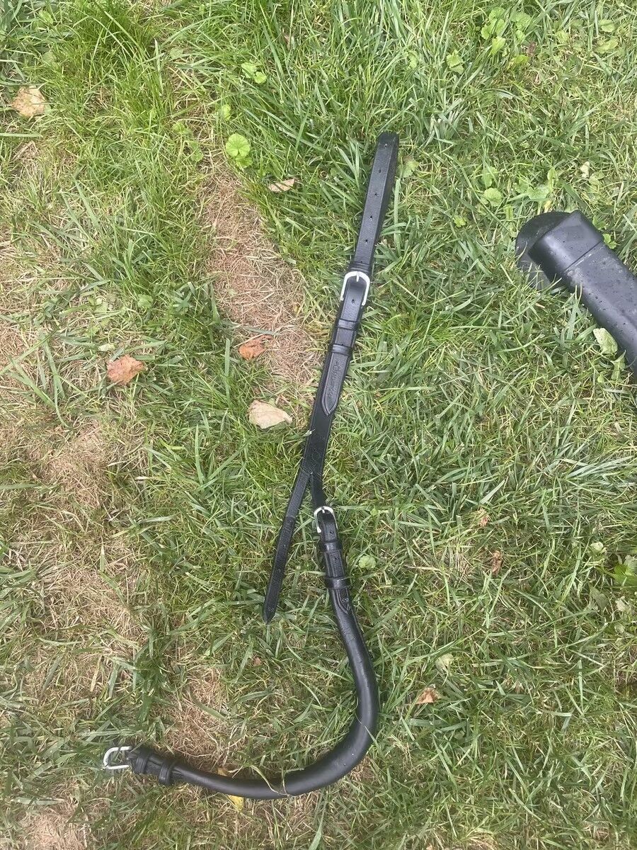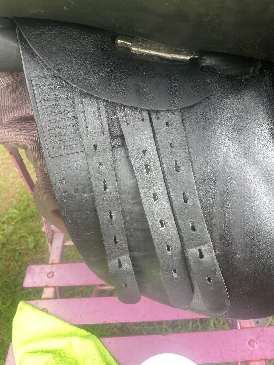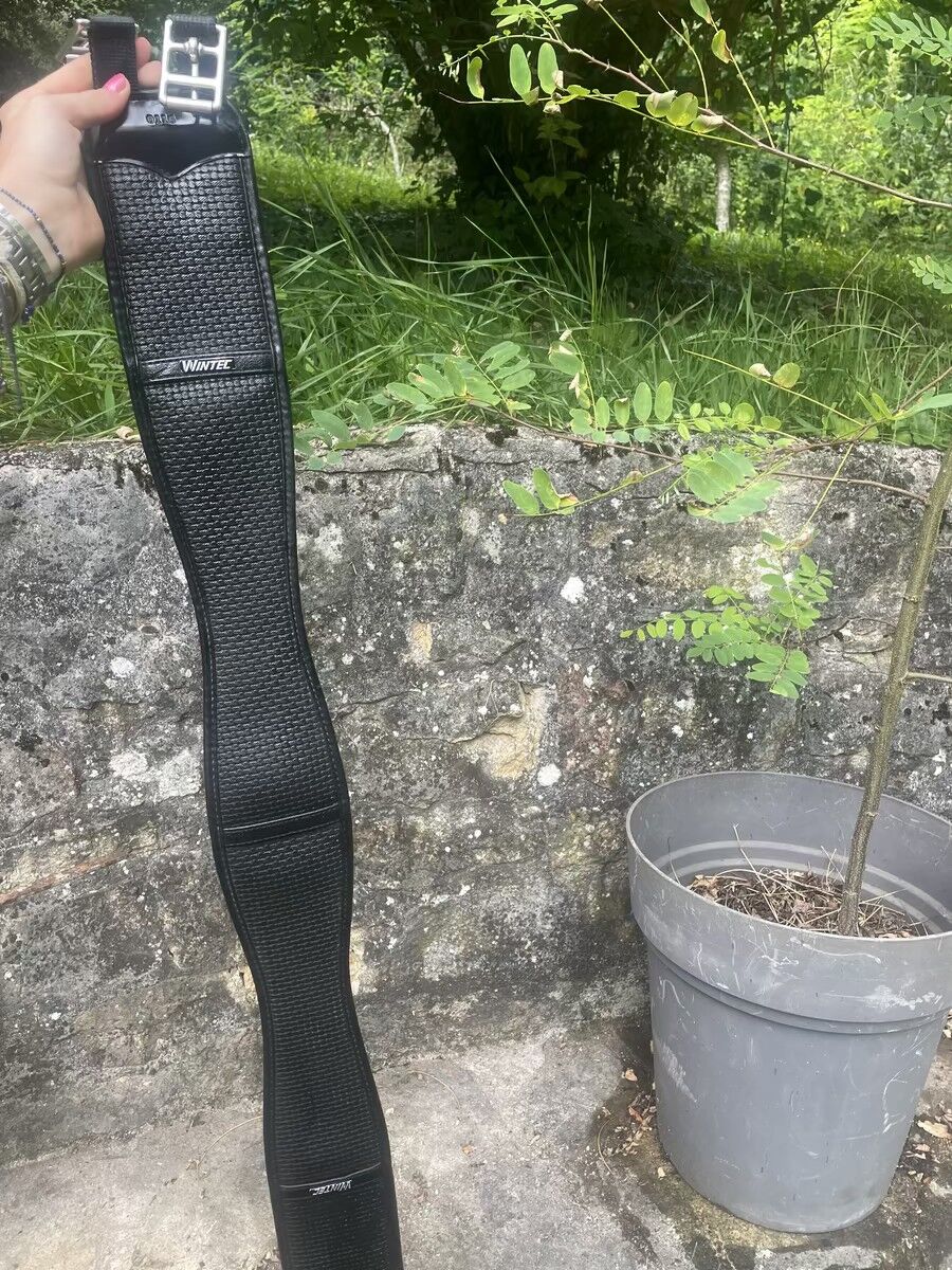 Je la vend avec deux sangles; une Wintec de 110cm ainsi qu'une fougenza de 85cm, une paire d'etriers de sécurité élastique (avec une deuxième paire d'élastiques), ils sont légèrement rouillés mais très fonctionnels, une paire d'étrivières et une croupière de marque fougenza ainsi qu'un sac a selle.