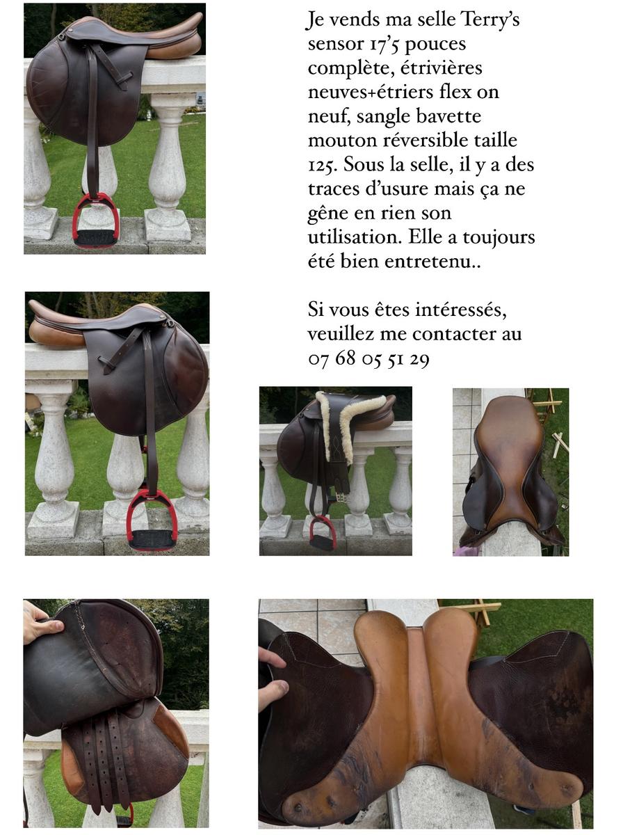 Bonjour, je vends ma selle Terry’s 17’5 pouce car pour des raisons personnelles, j’arrête mon activité sportive, la selle est vendue, tout équipé avec étrivière et étrier flex on neuf, une sangle bavette en mouton réversible taille 125.